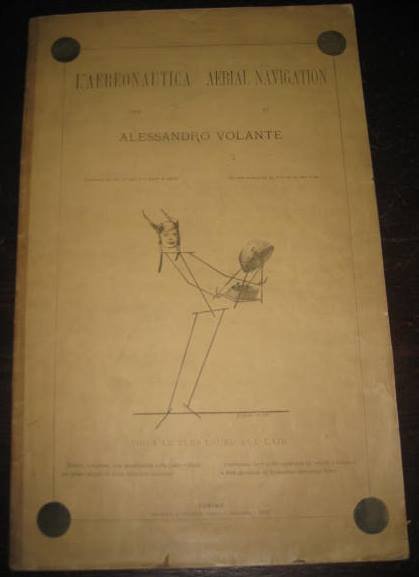 In-4° (432x271mm), pp. XXIV, brossura editoriale con titolo a stampa e illustrazione stilizzata dovuta allo stesso Volante entro filetto tipografico con motivi sferoidali accantonati; l'illustrazione raffigura 'una macchinetta colla quale ottenni un primo saggio di forza ascensiva dinamica'. La brossura di tergo fornisce un elenco di altri lavori dell'autore. Frontespizio con il titolo a stampa disposto nella parte sinistra e il ritratto fototipico dell'autore in quella destra. Testo bilingue, italiano ed inglese, disposto su duplice colonna. Illustrazioni litografiche in b.n. sia f.t. che n.t., con curiose raffigurazioni di aerostati e spedizioni aerostatiche, talora con singolari venature pre-surrealiste. Qualche minimale fioritura. Ottimo stato. Prima e unica edizione di singolare pubblicazione sulla navigazione aerea scritta e illustrata dal veterinario piemontese Alessandro Volante. In calce al frontespizio: 'Torino, 1870-71-72. Non ambisco brevetti d'invenzione né proprietà letteraria'. L'opera è dedicata al figlio dell'autore, morto a soli 4 anni a causa del croup. Il Volante fu autore di svariati ed estrosi scritti di veterinaria e di argomento scientifico: Tellurico bacio e danza, Il piu grande avvenimento del secolo ossia la priorita degli Italiani nella definizione scientifica o scoperta tecnica del polo nord; La luce a gaz ed il calore; Eureka areostatica al pie della ferrea corona, ecc. Un solo esemplare in SBN, alla Civica Centrale di Torino.