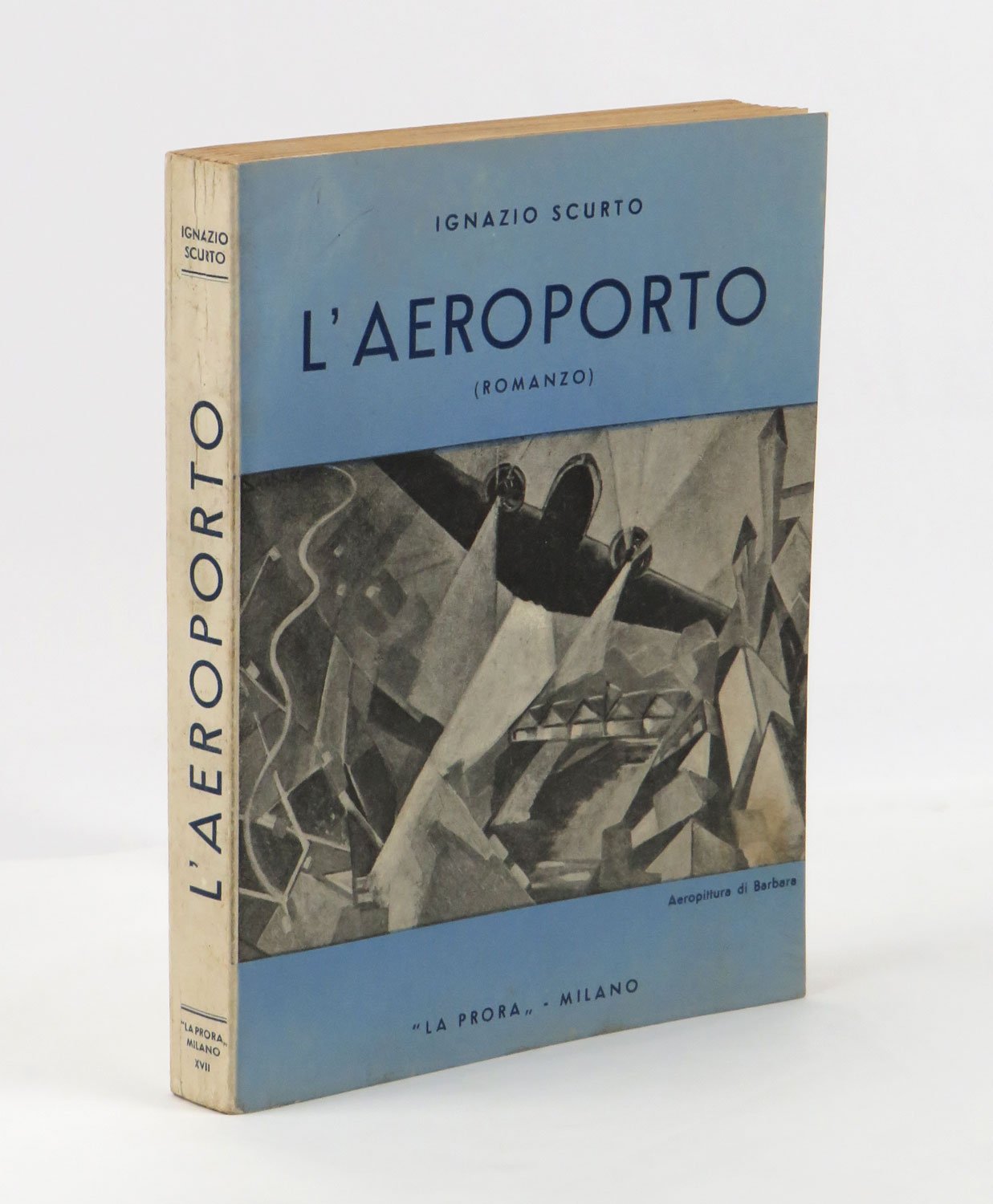 - brossura stampata in blu ai piatti e al dorso; in copertina riproduzione in scala di grigio dell’aeropittura di Barbara «L’aeroporto abbranca l’aeroplano» (1938);
