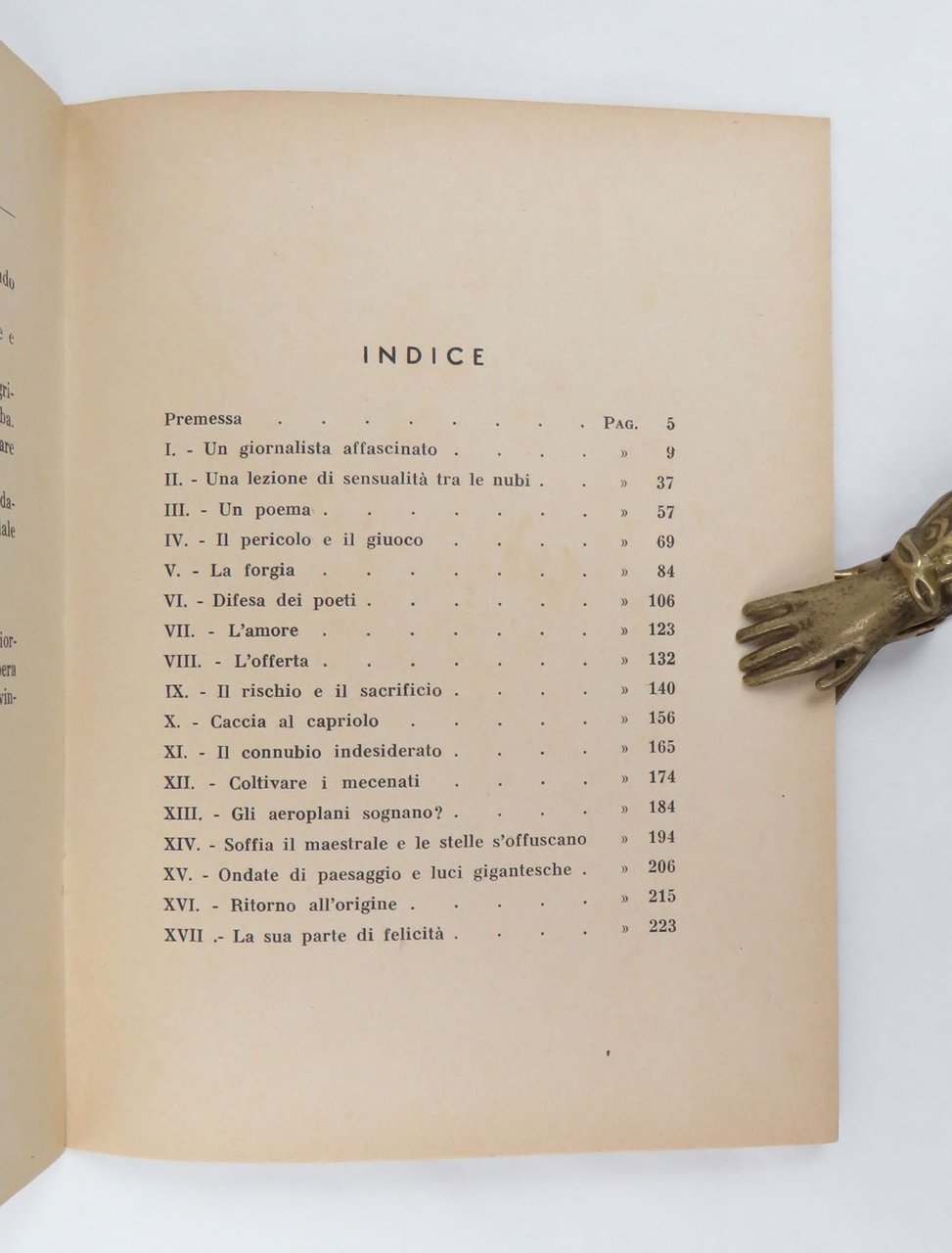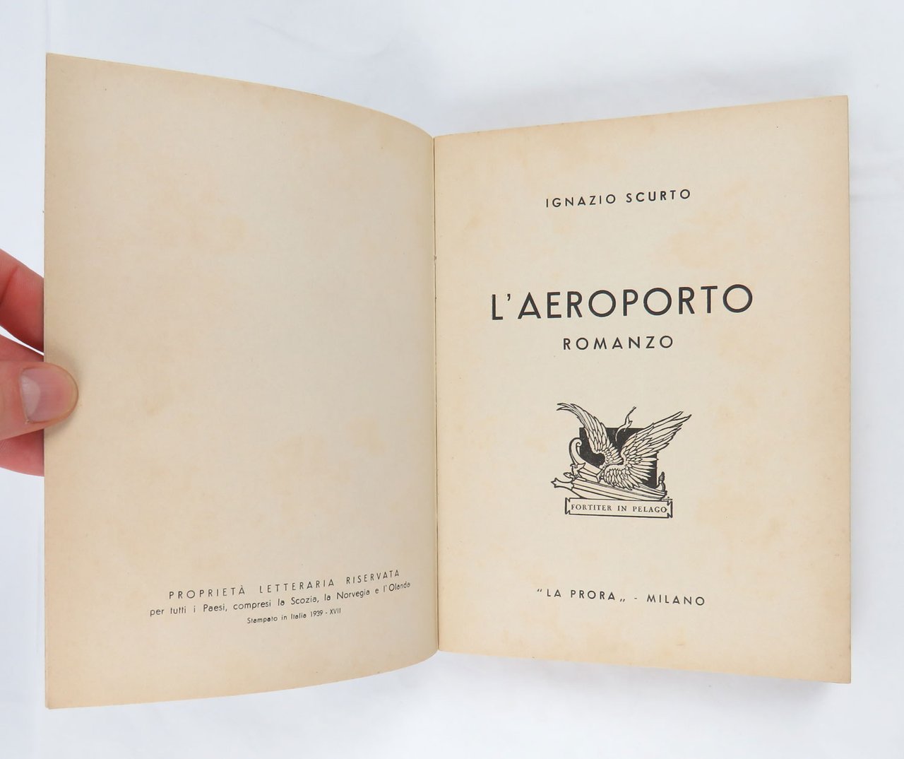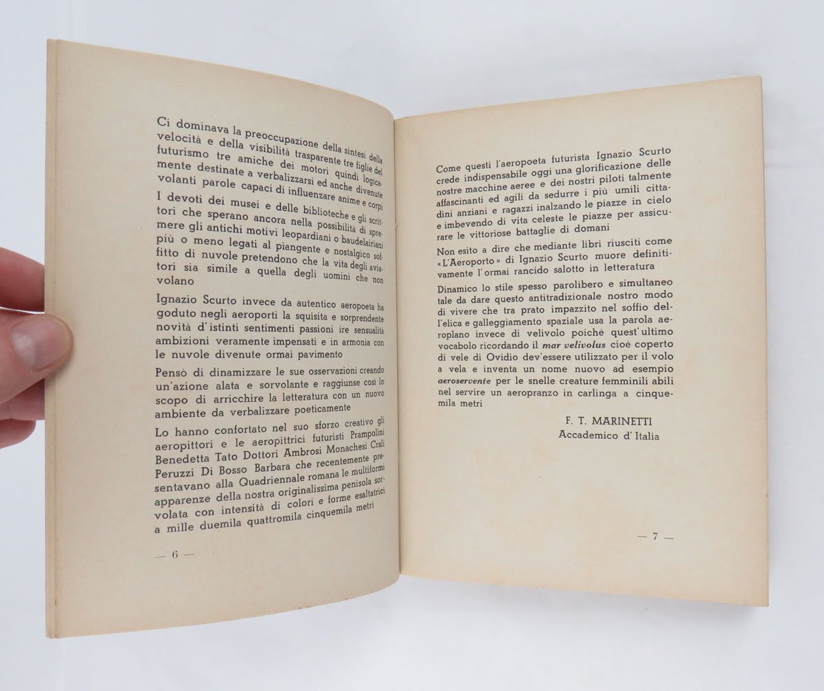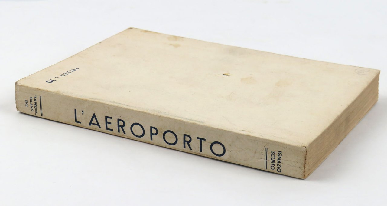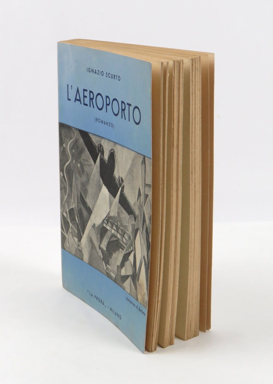 LIBROEdizione originale. Ottimo esemplare, fresco, pulito e squadrato: molto raro a trovarsi in queste condizioni.Rarissimo romanzo del futurista Scurto, probabilmente il suo capolavoro narrativo e libro-simbolo della tarda stagione dell’aerofuturismo anche grazie alla bella copertina dominata da un’aeropittura della compagna dell’autore, Olga Biglieri alias «Barbara aviatrice futurista»: si tratta di «L’aeroporto abbranca l’aeroplano», un grande olio (80 x 120 cm) esposto alla Biennale di Venezia l’anno precedente. E proprio l’aeropittrice si scorge in filigrana del personaggio più interessante del romanzo, l’aviatrice Tulliola, il perno attorno al quale si sviluppa tutta la vicenda: per amore di lei il giornalista e poeta Michele — alter ego dell’autore — diverrà un aviatore provetto sino a confrontarla in un circuito aeronautico nei cieli d’Italia; ne uscirà vincitrice proprio la donna, che scoprirà però di essersi perdutamente innamorata di quel poeta trasformato in aviatore, scomparso durante la gara, e tornerà nei cieli per salvarlo. L’«Aeroporto» si configura anche e soprattutto un sincero tributo dell’autore alla donna della sua vita. -- La prefazione/collaudo di Marinetti, tra le altre cose, mette l’opera di Scurto in relazione ideale con una recente esposizione futurista alla Quadriennale di Roma, dove gli intenti documentari e propagandistici dell’aeropittura avevano ormai sopravanzato le tendenze astratte e surrealiste dominanti, invece, nella prima metà dell’ultimo decennio del futurismo. Il libro fu premiato al concorso letterario aeronautico indetto entro la cornice della Fiera di Padova e presieduto, guarda caso, proprio da Marinetti, che giudicò il romanzo degno di condividere il primo posto a pari merito con «Il libro del volo» di Giuseppe Lo Duca e «Aria madre» di Castrense Civello (notizia riscontrata su «L’Ala d’italia» del luglio 1939, p. 79).Cammarota, Futurismo, 433.7