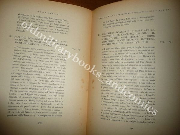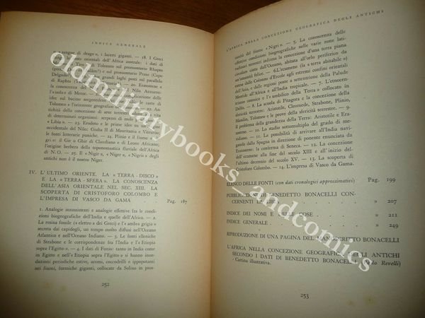 DESCRIZIONE: A cura del Ministero dell'Africa Italiana Signorelli Roma 1942 I^ Ed., br. ed. ill. pp. 253 con una tav. f.t. con facsimile del manoscritto originale del Bonacelli, un ritratto fotografico f.t. del Bonacelli e una carta geografica impressa in bianco, in rosso e in nero ripiegata f.t. in 8°, . Collezione Scientifica e Documentaria dell'Africa Italiana. L'autore discorre dapprima dell'Africa come orizzonte geografico dei Fenici, dei Greci e dei Romani, prendendo poi a discorrere delle concezioni climatiche, etnografiche, naturalistiche e delle determinazioni geodetiche relative all'Africa nell'antichità. Lo studio indaga poi il commercio dei prodotti dell'Arabia e dell'Africa Orientale, il problema del Nilo, il periplo del Mar Eritreo, le prime concezioni biogeografiche e l'ipotetica connessione del Nilo col Niger, il problema della "Terra-disco" o della "Terra-sfera" e le conoscenze geografiche del Medioevo, la scoperta di Colombo e l'impresa di Vasco da Gama ed il definitivo ampliarsi dell'orizzonte geografico dell'umanità. La progressione delle conoscenze geografiche sull'Africa è posta in stretta relazione con lo sviluppo delle concezioni geomatematiche, climatiche e biogeografiche degli antichi. Indice completo in foto a fine inserzione. CONDIZIONI: Perfette. PESO: 543 gr. without package