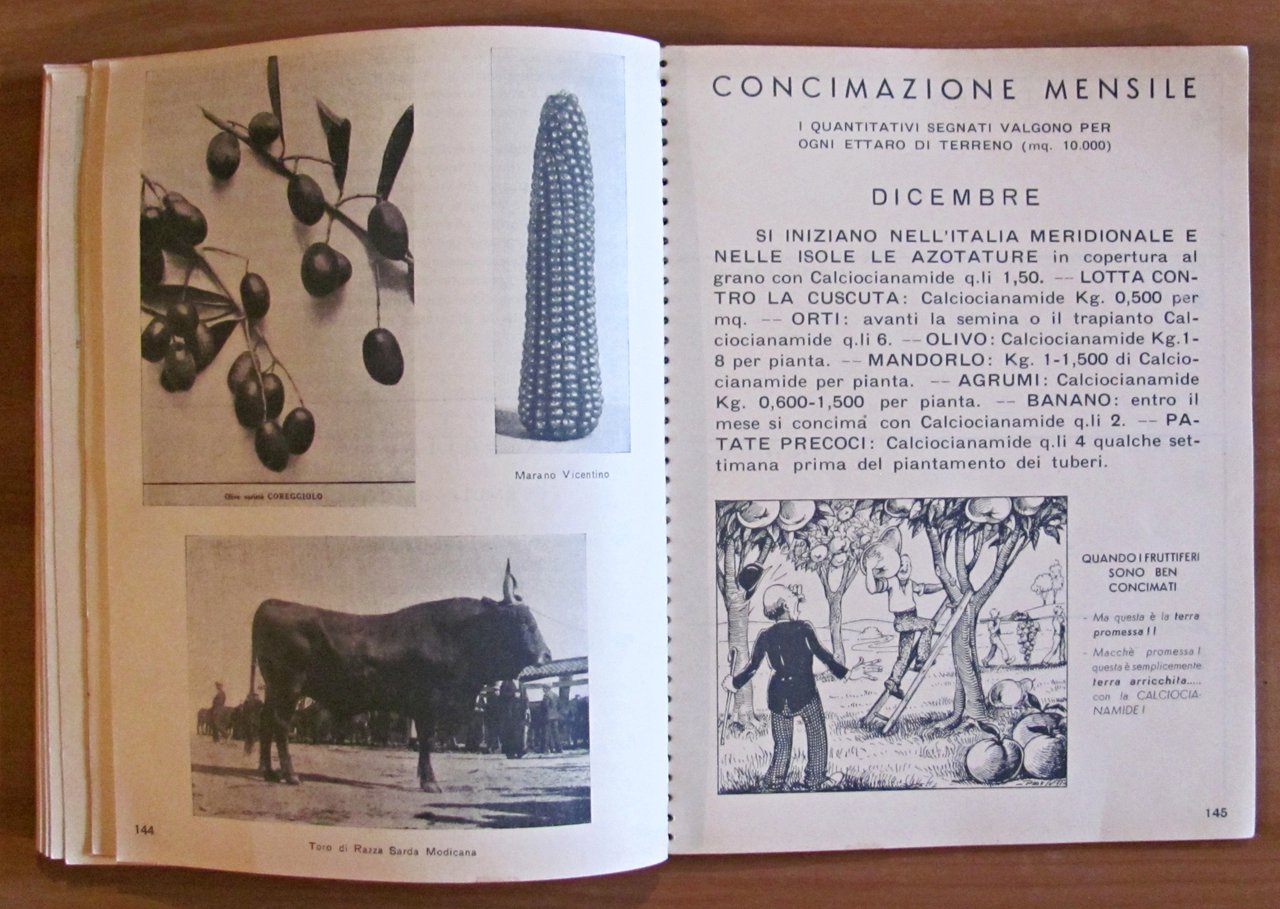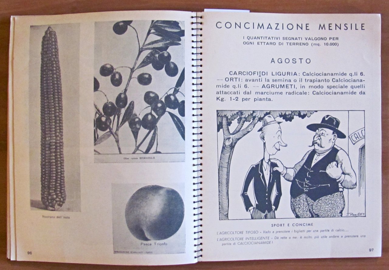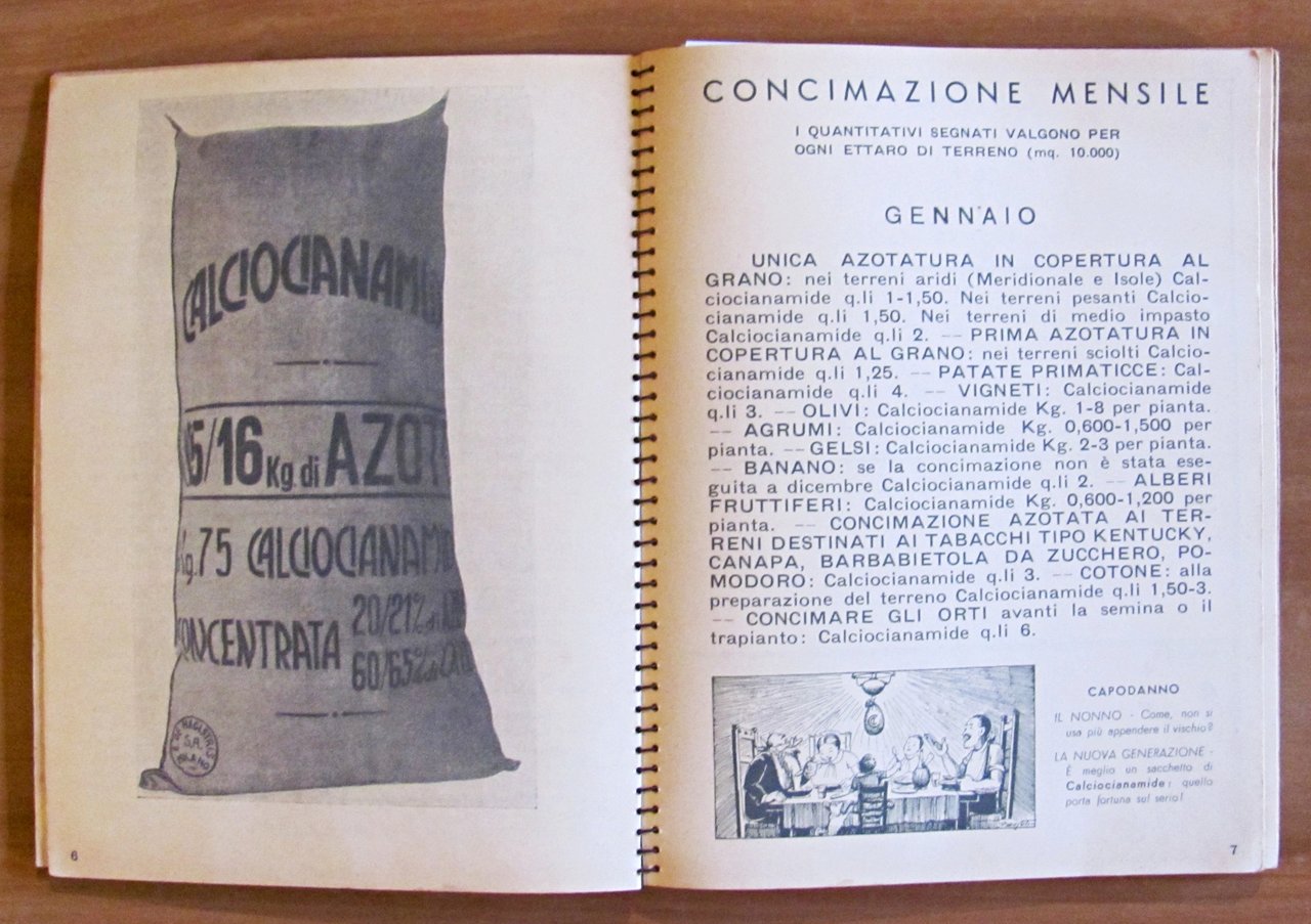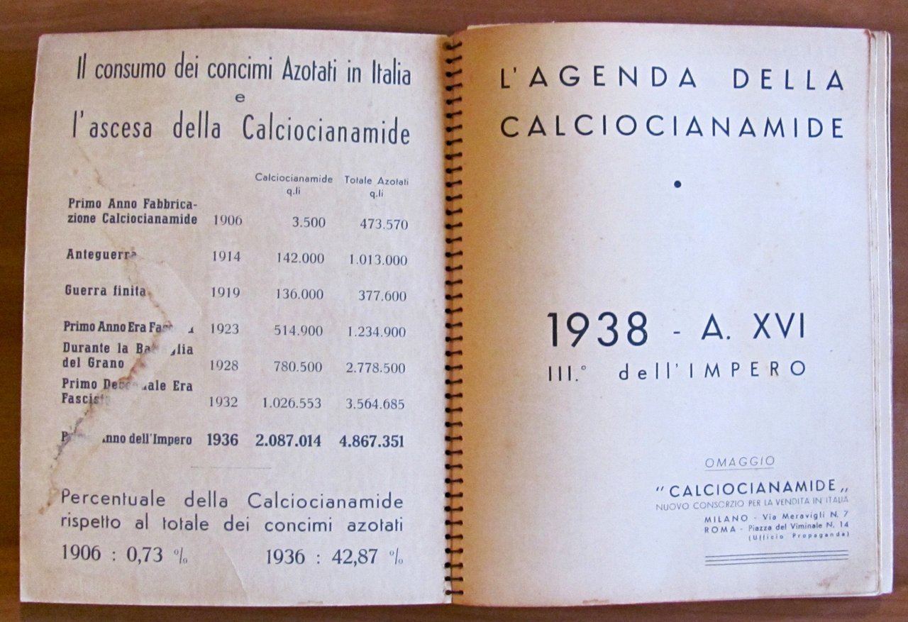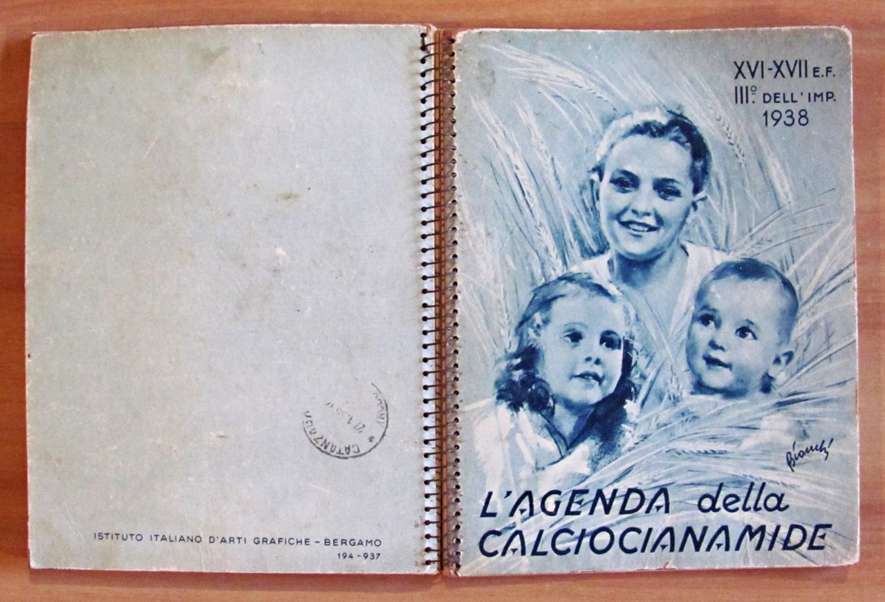 1938 - Ano XVI - III dell'Impero. Omaggio "Calciocianamide" Nuovo Consorzio per la vendita dei Concimi in Italia. Illustrazioni fotografiche in b/n a piena pagina e simpatiche illustrazioni in b/n n.t., una per ciascun mese dell'anno. Istituto Italiano d'Arti Grafiche - Bergamo, 1938. Cartonato editoriale con dorso a spirale con vecchio timbro alla retrocopertina. 16x21; pp.170. Agenda pubblicitaria della Calciocianamide con indicazioni d'uso e consigli agli agricoltori e vantaggi del prodotto pubblicizzato. Raro e in Buonissimo stato. , Molto buono (Very Good)