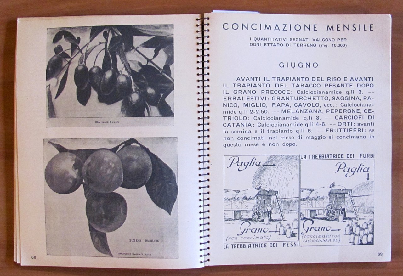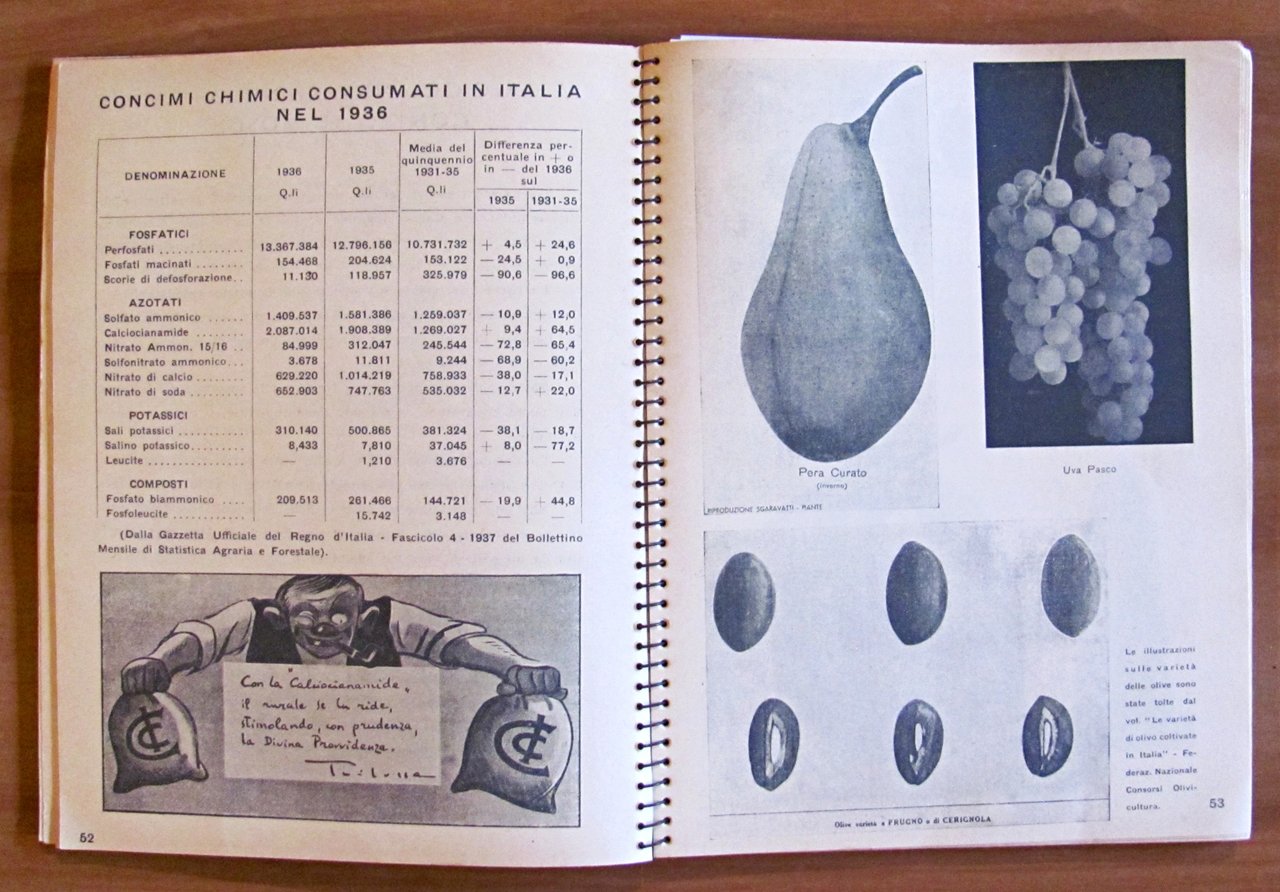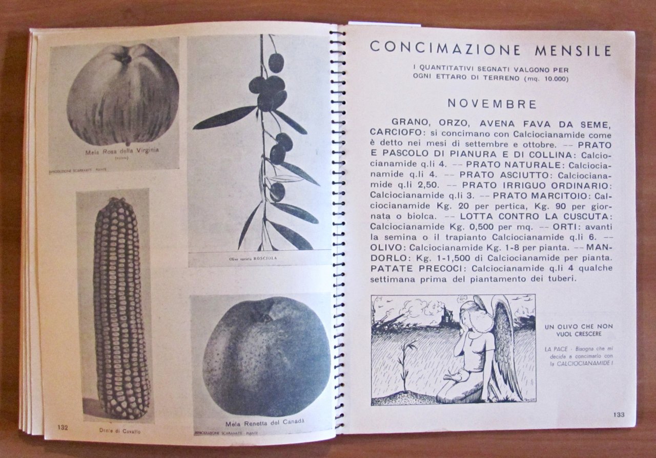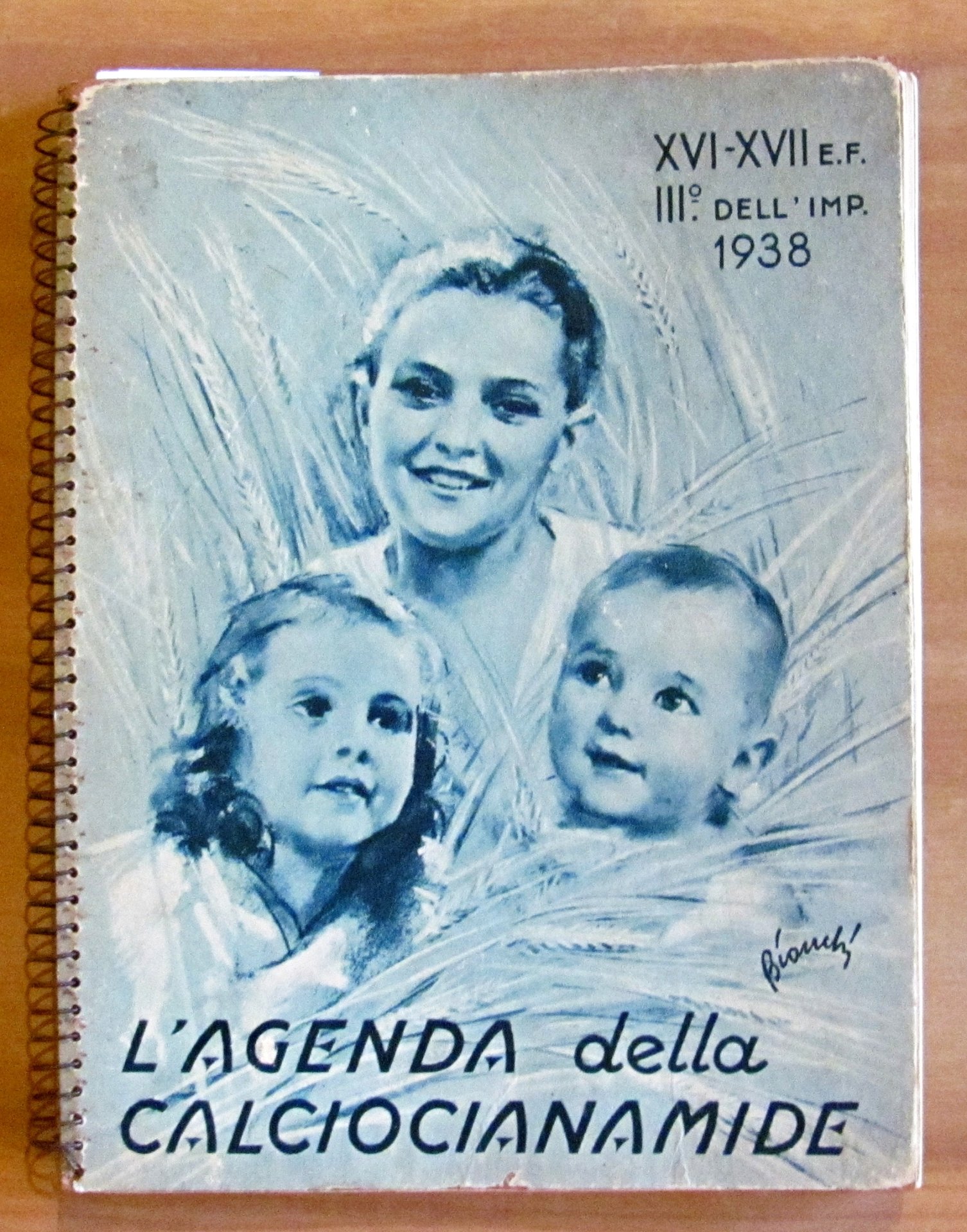 1938 - Ano XVI - III dell'Impero. Omaggio "Calciocianamide" Nuovo Consorzio per la vendita dei Concimi in Italia. Illustrazioni fotografiche in b/n a piena pagina e simpatiche illustrazioni in b/n n.t., una per ciascun mese dell'anno. Istituto Italiano d'Arti Grafiche - Bergamo, 1938. Cartonato editoriale con dorso a spirale con vecchio timbro alla retrocopertina. 16x21; pp.170. Agenda pubblicitaria della Calciocianamide con indicazioni d'uso e consigli agli agricoltori e vantaggi del prodotto pubblicizzato. Raro e in Buonissimo stato. , Molto buono (Very Good)