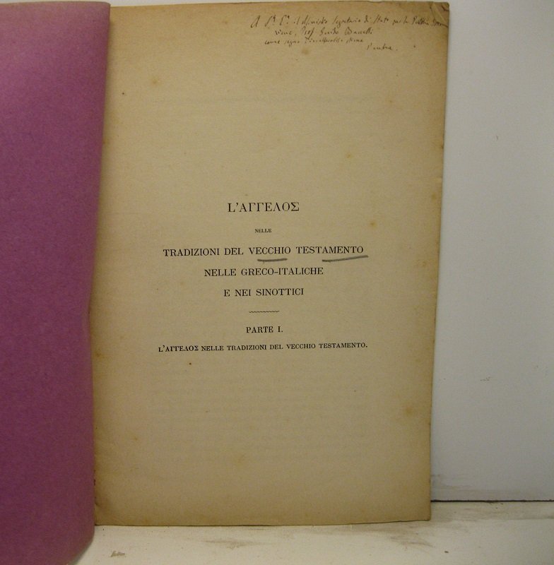 In 8, pp. 26 + (2b). Dedica autogr. dell'A. al fr. Br. muta coeva. Interessante studio sulla figura dell'aggelos, il messaggero, che - secondo l'A. - non si sarebbe mai introdotta nella letteratura greca e nell'Occidente latino se non fosse stata innestata nella traduzione greca del Vecchio Testamento in cui comparirebbe per la prima volta.