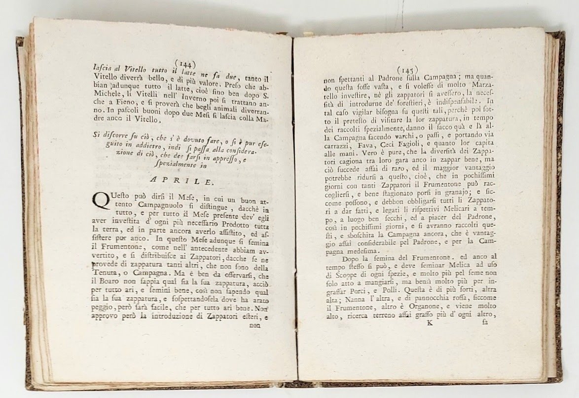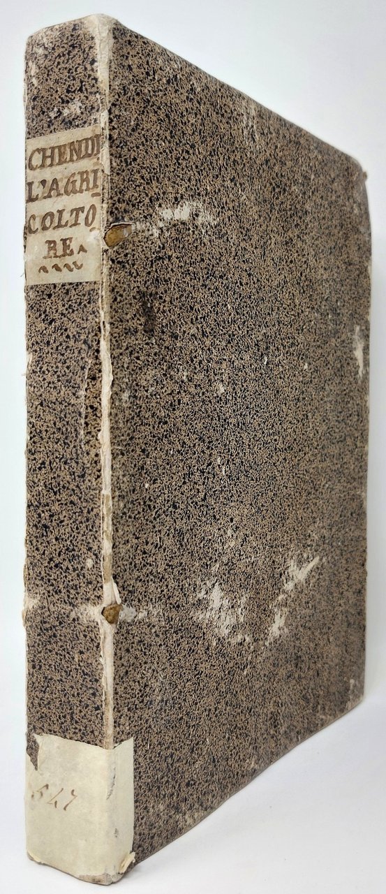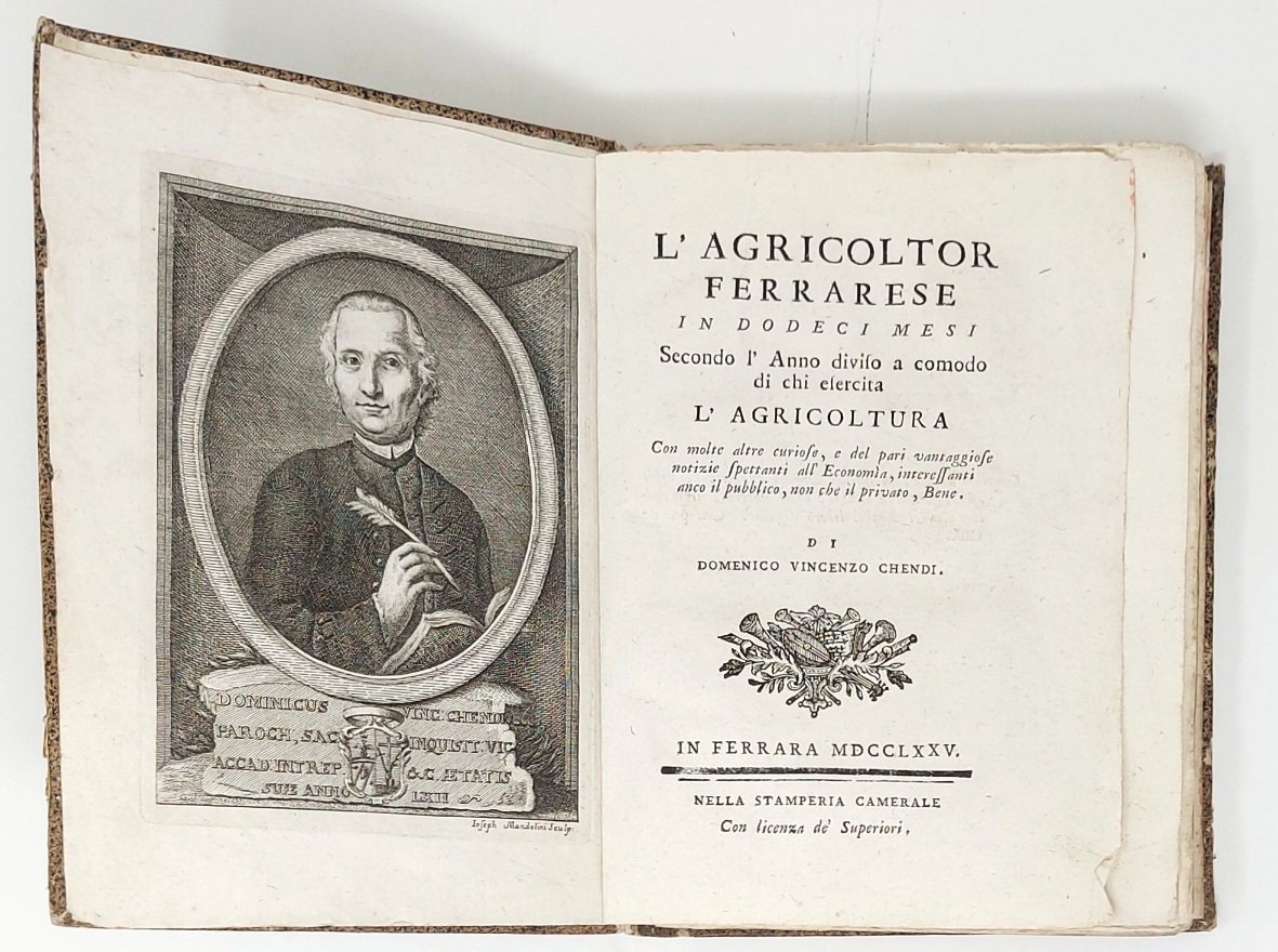 >in-4 (214x150 mm), pp. (4 compreso titolo e antiporta inciso in rame da Giuseppe Mandolini raffigurante l'autore), 332, legatura coeva in carta spruzzata, titolo manoscritto su tassello in carta al dorso. Apparentemente prima ed unica edizione di questo raro scritto di Domenico Chendi, parroco di Tresigallo, vicino a Ferrara. In dodici capitoli, uno per mese dell'anno, elargisce consigli agricoli ai contadini, e di amministrazione domestica e ricette alle massaie. Ottimo esemplare. B.I.N.G. 480.