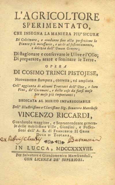 Opera dedicata al Marchese Vincenzo Riccardi. Cm.16,7x10,7. Pg.(32), 446; 56. Legatura allentata in piena pergamena rigida, con titoli manoscritti al dorso a quattro nervi. Capilettera e cartigli ornamentali. In fine, con numerazione autonoma, "Trattato de' castagni, tanto per uso delle Selve, che de' Polloneti. Delle qualità della Terra più atta e propria per uso de' Vivaj di Castagni, e del tempo, e del modo di prepararla, per seminarvi le Castagne". Importante opera di agraria dell'agronomo pistoiese Cosimo Trinci (? - 1756), articolata, nella presente terza edizione, in 11 Trattati: "Delle viti; delle uve e de' vini; de' gelsi; degli ulivi; delle piante de' fichi; delle pera; degli agrumi; degl'innesti; di arare e seminare le terre; de' cocomeri; de' lavori, semente, potature, ed altre cose che accadono mese per mese". Nelle edizioni successivi il "Trattato de' castagni" verrà integrato nel testo. Fu, al tempo, il testo principale e più diffuso tra gli agricoltori italiani, vantando numerose ristampe. Le due precedenti stampe datano 1726 (Lucca, Marescandoli) e 1733 (Rovereto, Berno). > Gamba, 2478, in riferimento all'edizione 1726, "Cosimo Trinci di Pistoia fu direttore di agrarie faccende, e particolarmente nel Territorio di Lucca; i suoi precetti sono tutti appoggiati alla pratica, e precisamente toscana; e sebbene invaso troppo da certi pregiudizi ha però saputo dettar buone regole: questo libro è utile, e non a torto il Sig.Paoletti lo stimava il migliore da porsi in mano de' fattori del suo paese (Filippo Re)". "Editoria e riforme a Pisa, Livorno e Lucca, nel '700", 100. Simon, "Bibliotheca Vinaria", 84, cita l'edizione veneziana del 1805. Kress, 6229. Bagnasco, II, 1952-1955; e Capponi, 329-330, annotano altre edizioni. Codice libreria 130971.