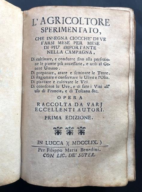 Prima originale edizione. In Lucca, per Filippo Maria Benedini, 1759. In 8vo piccolo (cm 1,5 x 16,5 circa), pp. XXVJ (con una nota al “Benigno Lettore” e con l’Indice de’ Capitoli), 556 (con la “Tavola delle Materie contenute nelle Tre Parti di questo Trattato”). I capitoli toccano argomenti molto ricercati: Discorso in Generale sopra l’Agricoltura, Trattato delle Viti, Trattato delle Uve e de’ Vini, Trattato de’ Gelsi, Trattato degli Ulivi, Trattato delle Piante de’ Fichi, Trattato delle Pera, Trattato de’ Castagni, Trattato de’ Ciriegi, Trattato degl’Agrumi, Trattato degl’Innesti, Trattato di arare e seminare le Terre, Trattato de’ Cocomeri. Leg. orig. in piena pergamena con il titolo breve manoscritto al dorso "Agricoltura". Il nome dell'Autore in scrittura corsiva coeva alla prima bianca, tracce di sporco alla legatura, dorso leggermente scollato, uniformemente bruniti, ma in modo leggero, il frontespizio, le primissime pagine e alcune altre pagine all'interno, nell’insieme esemplare in margini e ben conservato.