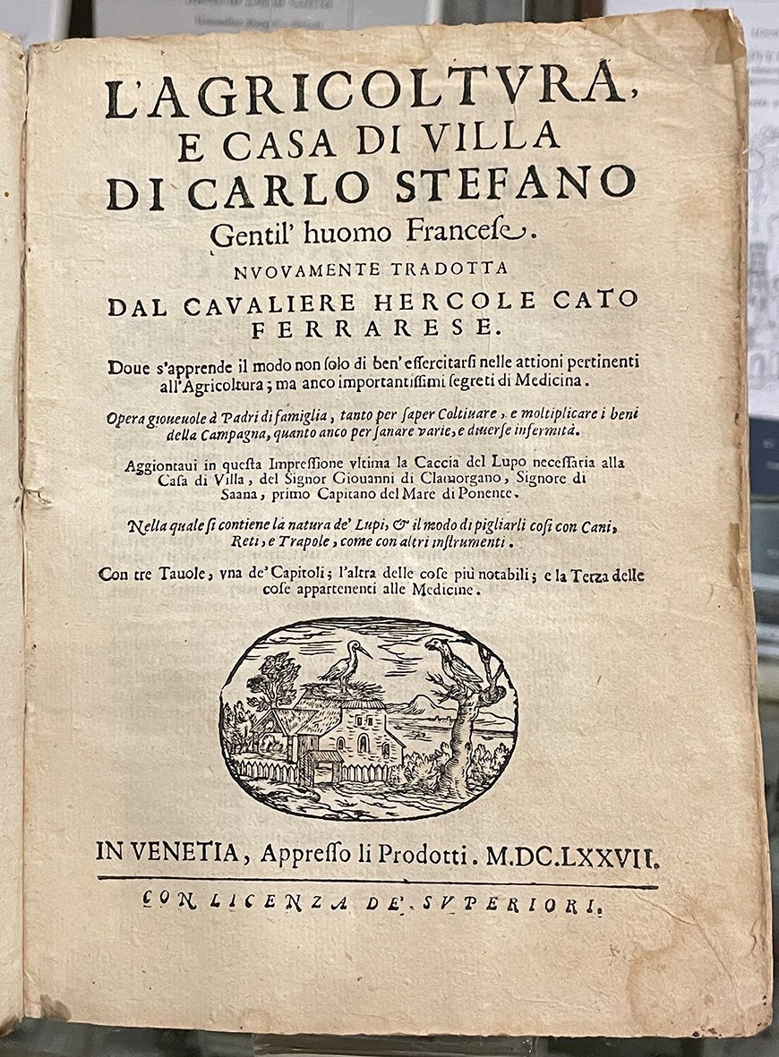 (Agricoltura-Caccia-Ediz. del ‘600) STEFANO Carlo. L’Agricoltura e casa di villa di C.S. Gentil’huomo Francese. Nuovamente tradotta dal Cavalier Hercole Cato ferrarese. Dove s’apprende il modo non solo di ben essercitarsi nelle attioni pertinenti all’Agricoltura; ma anco importantissimi segreti di Medicina. Aggiontavi in questa Impressione ultima la Caccia del Lupo. Nella quale si contiene la natura de’ Lupi, et il modo di pigliarli cosi con Cani, Reti, e Trappole, come con altri Instrumenti. In Venetia, 1677. In-4°, (16x22), leg. coeva con tit. calligr. al dorso; Pp. (32)-368. Vign. incisa al front. Ottimo esemplare di questo antico trattato che fornisce nozioni di agricoltura, allevamento, caccia, medicina e gastronomia.