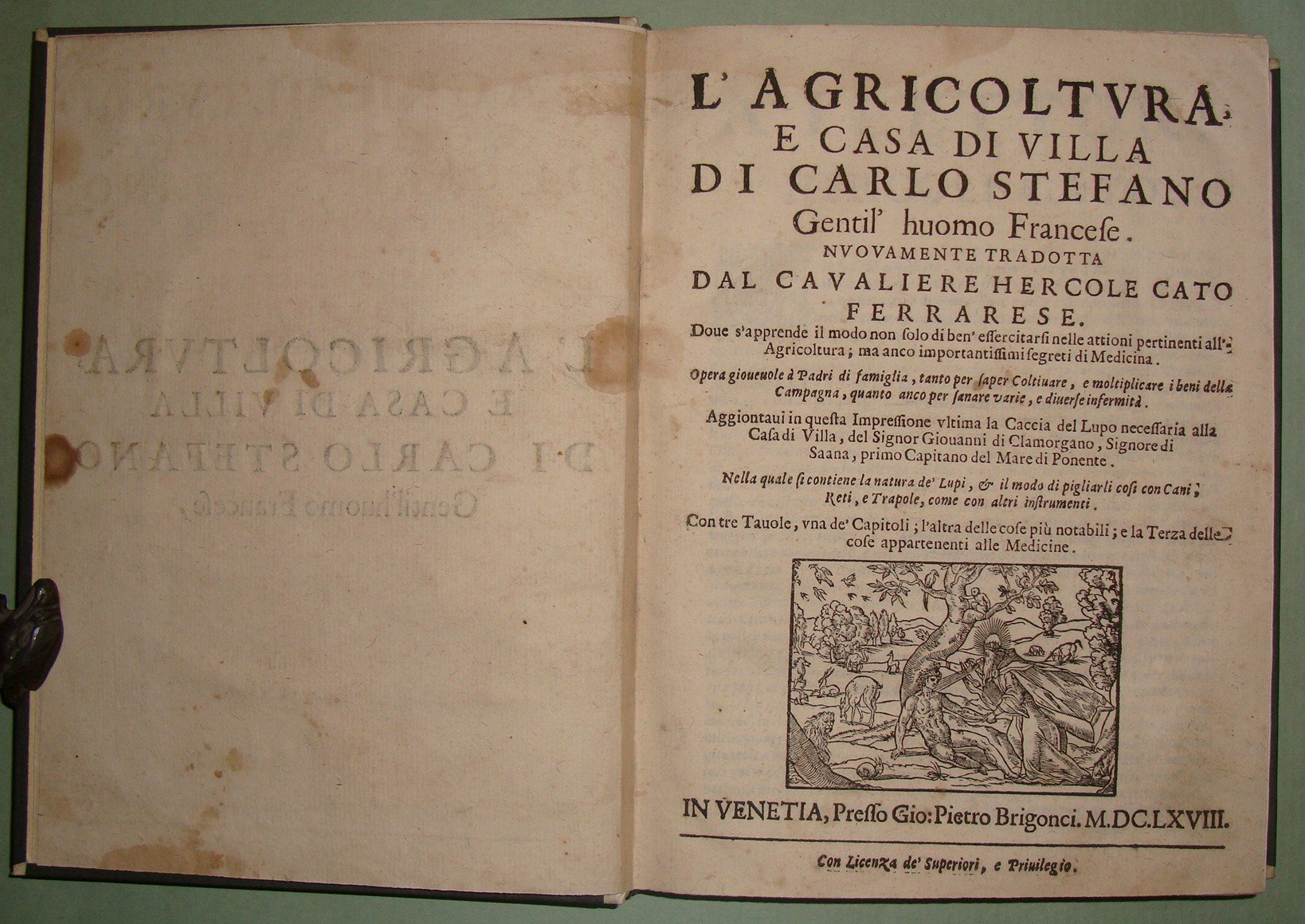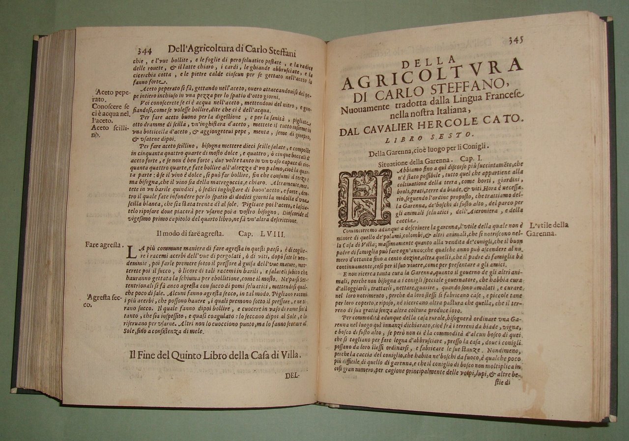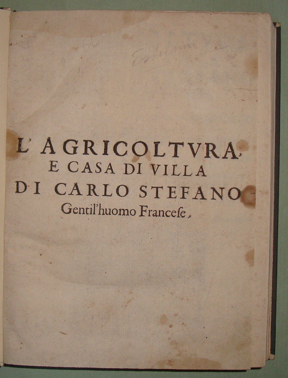 ESTIENNE Charles. L'agricoltura et casa di villa di Carlo Stefano gentil'huomo francese. Nuovamente tradotta dal Cavaliere Hercole Cato. Aggiuntavi in questa impressione ultima la Caccia al Lupo necessaria alla casa di villa del Signor Giovanni di Clamorgano. In Vinetia, Brigonci, 1668. In 8vo; pp. 36 n.nn., pp. 427. Lievi tracce d'umido. Mezza pelle posteriore, tassello al dorso. Giardini de' fiori e de' gl'arbori fruttiferi, praterie, coltivazione de'grani e legumi in terre lavorate, della vite, della garenna cioè luogo per li conigli, la caccia del cervo, del cinghiale, della lepre, de gli uccelli, la falconeria e la caccia del lupo. Ceresoli, pag. 499; Lastri, 121; Souhart, 175.