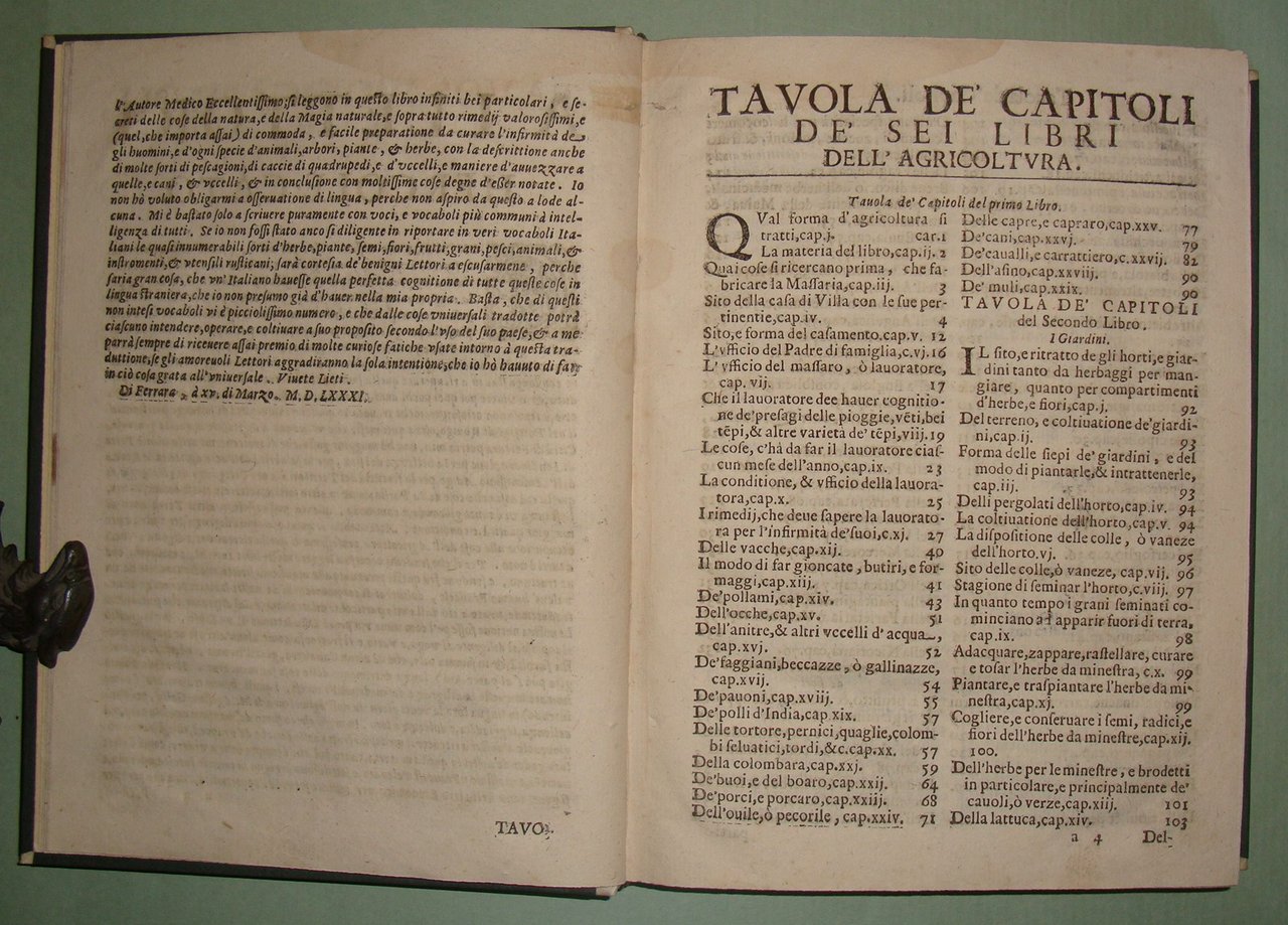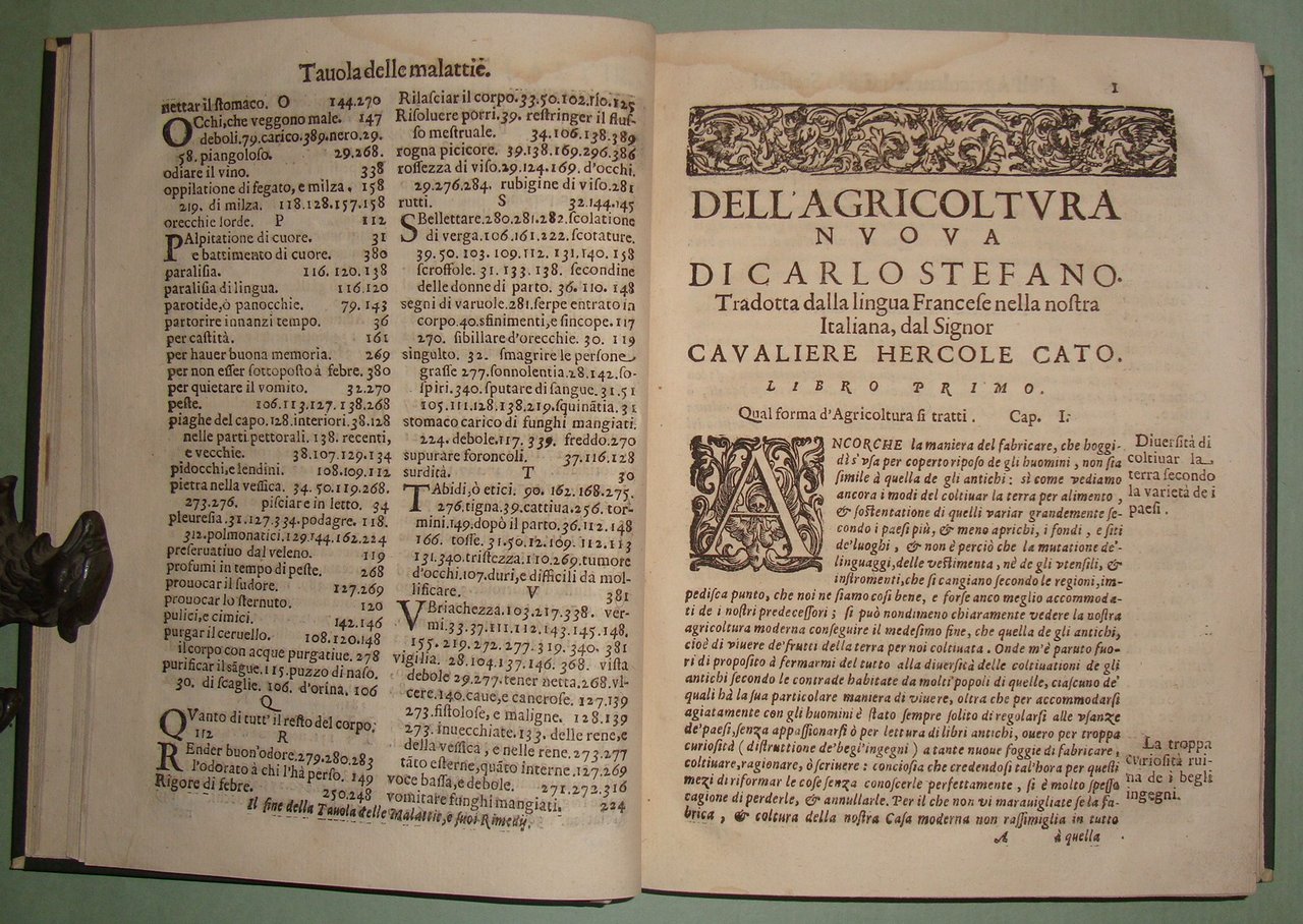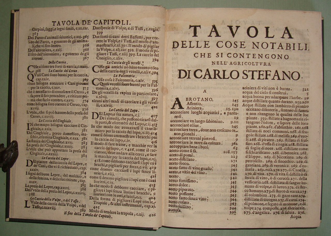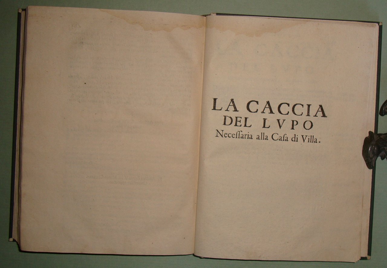 ESTIENNE Charles. L'agricoltura et casa di villa di Carlo Stefano gentil'huomo francese. Nuovamente tradotta dal Cavaliere Hercole Cato. Aggiuntavi in questa impressione ultima la Caccia al Lupo necessaria alla casa di villa del Signor Giovanni di Clamorgano. In Vinetia, Brigonci, 1668. In 8vo; pp. 36 n.nn., pp. 427. Lievi tracce d'umido. Mezza pelle posteriore, tassello al dorso. Giardini de' fiori e de' gl'arbori fruttiferi, praterie, coltivazione de'grani e legumi in terre lavorate, della vite, della garenna cioè luogo per li conigli, la caccia del cervo, del cinghiale, della lepre, de gli uccelli, la falconeria e la caccia del lupo. Ceresoli, pag. 499; Lastri, 121; Souhart, 175.
