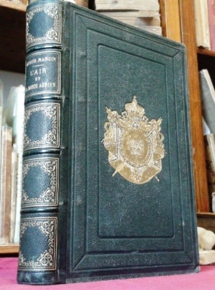 Volume in 8 grande, bella legatura alle Armi di Napoleone III, in pelle e tela, titolo al dorso a quattro nervi, decorato in oro a scomparti, grande stemma al piatto anteriore, impresso e dorato, florion centrale al piatto posteriore, tagli dorati, sguardie telate, bianca, occhiello, tavola d'antiporta, frontespizio con vignetta silografica, prefazione, 5 cc., 551 pp., sommario e bianca finale, numerosissime illustrazioni silografiche n.t. molte delle quali a piena pagina ad opera di Freeman, Yan'dargent, Desandre', Guiguet, Lix, Oudinot, Richard. Fresca piacevolissima edizione di quest'opera divulgativa, si, ma estremamente interessante e d'ampio respiro. L'aria, sua composizione e i fenomeni fisici che la riguardano, come la luminosit, l'elettricit, il magnetismo, il clima e i vari fenomeni atmosferici, la pressione e la meccanica atmosferica; un intero capitolo dedicato all'areostatica ed all'areonautica; la terza parte del volume interamente dedicata, agli abitatori dell'aria, dai piccoli insetti alle pi straordinarie specie di uccelli. Il tutto arricchito da una ridondante, magnifica iconografia. Uno fra i pi bei libri di Arthur Mangin, fecondo autore di opere di buona divulgazione geografica e scientifica, in una elegante legatura alle armi di Napoleone III. In perfetto stato di conservazione, unica pecca una fioritura ai margini del foglio di sguardia anteriore e posteriore. Un ottimo regalo.