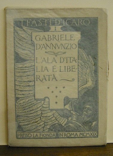 8vo (cm. 19,3), 73(1) pp. Testatina a p. 19 e fianlino a p. 73 di Adolfo De Carolis. Fra le pp. 56-57 facsimile d’autografo su doppio foglio rip., su carta con l’impresa ‘Squadra di San Marco. Ti con nu, nu con ti’. Brossura editoriale bianca a stampa nera illustrata da De Carolis. Sulla cop. posteriore l’impresa ‘Circumacta validus’. Ottimo esemplare. Edizione originale. De Medici, 99; Guabello, 241; Vecchioni, 62.
