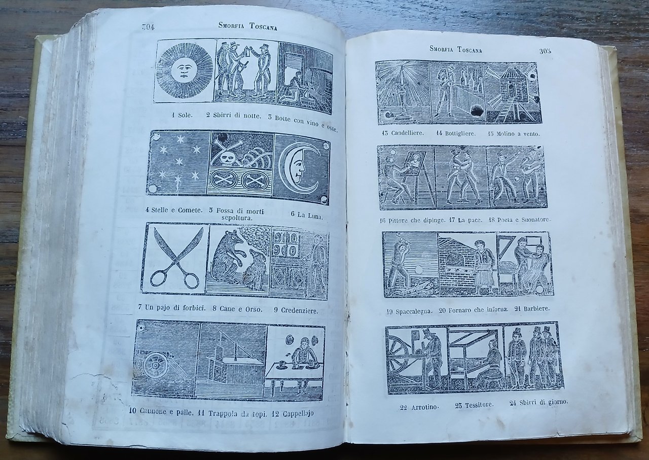 "Susseguita da una Raccolta di preziosissime Cabale sin'ora inedite, e dall'Istorico Elenco di tutte le estrazioni, cominciando dalla prima che ebbe luogo in Firenze il dì 23 Decembre 1739 fino all'ultima di Decembre 1854. Seconda edizione con aumenti, e correzioni." In 16° grande (cm 18,3x 12,5), legatura coeva in piena pergamena, dorso con impressioni dorate e tassello in pelle nera con titolo e filetti in oro, pp. 371,(1), con 90 figure nel testo (Smorfia toscana), 90 figure su VI tavole fuori testo (Smorfia romana), un disegno a pagina 312 inquadrato nel testo (Figura pentagona). Lievi mancanze ai bordi del tassello, lievi mende e strappetti al margine bianco di alcune pagine ma testo sempre integro, alcune piccole macchioline alla pagina dell'Indice ed al foglio di guardia e risguardo posteriore, per altro esemplare solido e ben conservato.
