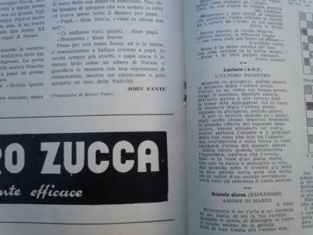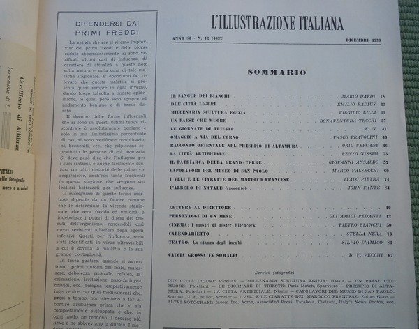 In 4°, cm 24,5 x 34,5; pp. 90. In questo numero: L'ALBERO DI NATALE (racconto) di John Fante; OMAGGIO A VIA DEL CORNO, Vasco Pratolini; DUE CITTA' LIGURI di Emilio Radius; LE GIORNATE DI TRIESTE di F. N.; RACCONTO ORIENTALE NEL PRESEPIO DI ALTAMURA di Orio Vergani; IL PATRIARCA DELLA GRAND-TERRE di Giovanni Ansaldo.