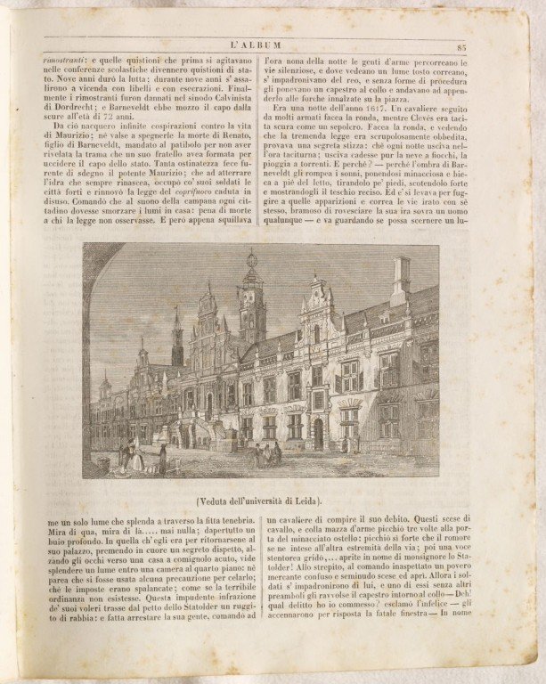 In 4. Dim. 27,5x22 cm. Pp. 8. Interessante numero del 14 Maggio 1842 de L'Album di Roma, una rivista di letteratura, arte, viaggi e archeologia. In copertina è presente una bella incisione di Padre Don Giovan Maria della Torre; all'interno la veduta dell'Università di Leida; il sultano Abdul Medjib. All'interno presenti alcuni articoli: Padre Don Giovan Maria della Torre, il sultano dell'impero Ottomano. In buone condizioni. Brossura editoriale in buone condizioni generali con lievi usure al margine sinistro. Legatura quasi assente. All'interno le pagine si presentano in buone condizioni con fioriture. Interesting number of the 6 of September 1856 of the L'Album di Roma, a magazine of litterature, art, voyages and archeology. In the cover there is a beautiful engraving of Padre Don Giovan Maria della Torre; inside the view of the University of Leida, the sultan Abdul Medjib. Inside different articles: Padre Don Giovan Maria della Torre, the Ottoman Empire and the sultan the sultan Abdul Medjib. In good conditions. Editorial cover in good general conditions slightly worn in the left edges. Binding is almost absent. Inside pages are in good conditions with foxings.