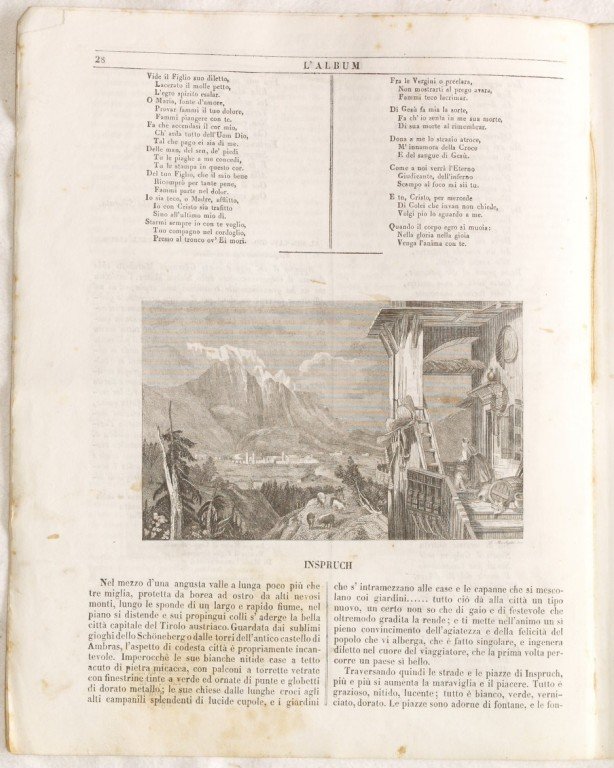 In 4. Dim. 27,5x22 cm. Pp. 8. Interessante numero del 26 Marzo 1842 de L'Album di Roma, una rivista di letteratura, arte, viaggi e archeologia. In copertina è presente una bella incisione con la Pietà di Annibale Carracci; all'interno una veduta di Inspruch, la Melolonta volgare. All'interno presenti alcuni articoli: Inspruch, la Melolonta volgare. In buone condizioni. Brossura editoriale in buone condizioni generali con lievi usure al margine sinistro. Legatura quasi assente. All'interno le pagine si presentano in buone condizioni con fioriture. Interesting number of the 26 of March 1842 of the L'Album di Roma, a magazine of litterature, art, voyages and archeology. In the cover there is a beautiful engraving representing the painting "La pietà" by Annibale Carracci; inside the view of Inspruch and the insect Melolonta volgare. Inside different articles: Inspruch. In good conditions, brownings. Editorial cover in good general conditions slightly worn in the left edges. Binding is almost absent. Inside pages are in good conditions with foxings.