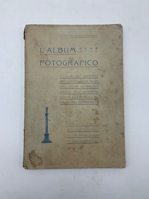 In 8, cm 17 x 24,5, pp. 110 con 28 tavole fotografiche fuori testo. Brossura editoriale con macchietta al piatto anteriore, danni riparati al dorso, fioritura sparse su alcune pagine. Rara pubblicazione realizzata in occasione del cinquantenario del dogma dell'Immacolata Concezione, risalente al 1854 e offerto alla Santita' di Pio X. Sono descritte circa 40 antiche immagini conservate in chiese e santuari della provincia di Torino. Tra queste: Consolata, Consolata di Savigliano, Consolata in Levone, Madonna di Belmonte sopra Valperga, della Stella a Rivoli, dell'Annunziata in Chieri, del Pilone a Moretta, di S. Giovanni a Sommariva Bosco, S. Desiderio in Vinovo, del Carmine presso Giaveno, dei Fiori a Bra, delle Grazie a Cavallermaggiore e a Racconigi, di Groscavallo a Forno Alpi Graie, del Pilone a Torino, della Bossola a Carmagnola, ecc.