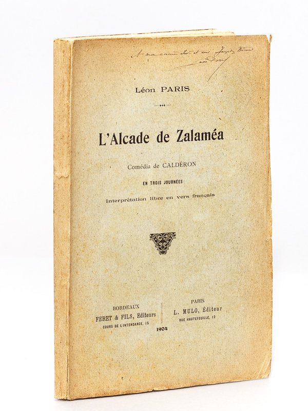 1 vol. in-8 br., Féret & Fils, Bordeaux, L. Mulo, Paris, 1904, 127 pp. Rare exemplaire de cette traduction de Calderon, dédicacée par l'auteur. Etat très satisfaisant (couv. lég. frottée avec petites fentes en mors)