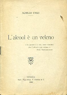 In-16°, pp. 29, (3), brossura editoriale. Bell'esemplare intonso. Unica edizione, non comune. Opuscolo diretto contro il consumo di bevande alcoliche e teso a sottolineare i danni causati dall'alcolismo all'organismo e alla psiche.