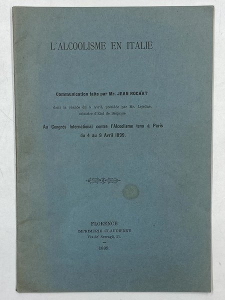 L’ALCOOLISME EN ITALIE. Communication faite par Mr. Jean Rochat (…) au Congrès International contre l’Alcoolisme tenu à Paris dru 4 au 9 Avril 1899. Florence, Imprimerie Claudienne 1899.