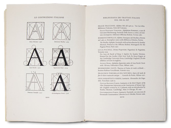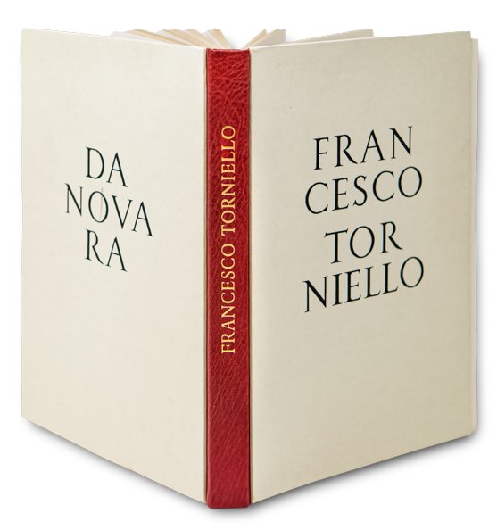 >in-4 (280x190 mm), pp. XXVII, 55, 26 tavole, 1 foglio sciolto. Legatura editoriale in mezzo marocchino rosso con piatti in Linson avorio, titoli impressi in oro al dorso e in nero al piatto anteriore, taglio sup. dorato. Entro custodia editoriale in Linson avorio. Ristampa del trattato e del facsimile della costruzione dell'alfabeto maiuscolo seguito dal confronto fra le maiuscole di Luca Pacioli e quelle del Torniello. Introduzione con alcune illustrazioni, esempi delle costruzioni geometriche di alfabeti fino al 1529 e bibliografia di Giovanni Mardersteig; la xilografia nel frontespizio è stata reincisa da Leonardo Farina. La presente edizione italiana è composta in Carattere Dante ed impressa su carta a mano dei fratelli Magnani, in ottantatre esemplari numerati (ns. 79) e sette ad personam. Il ritratto e le iniziali sono di Guillaume La Signerre. Perfetto esemplare. Catalogo Mardersteig, 169.