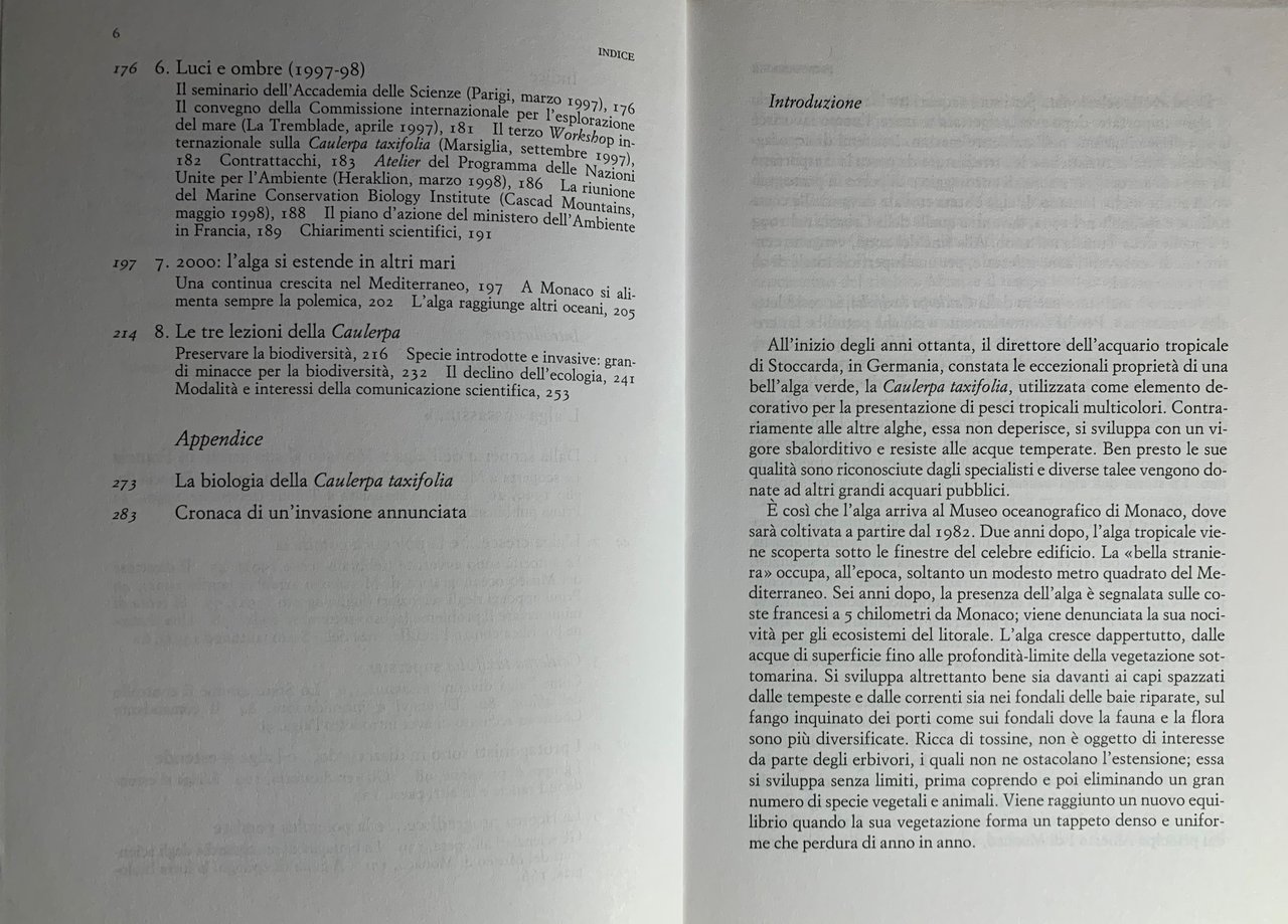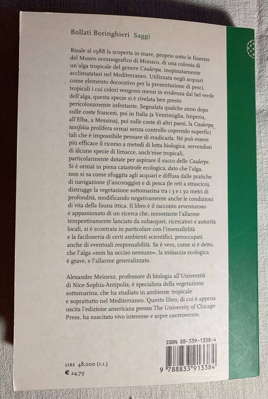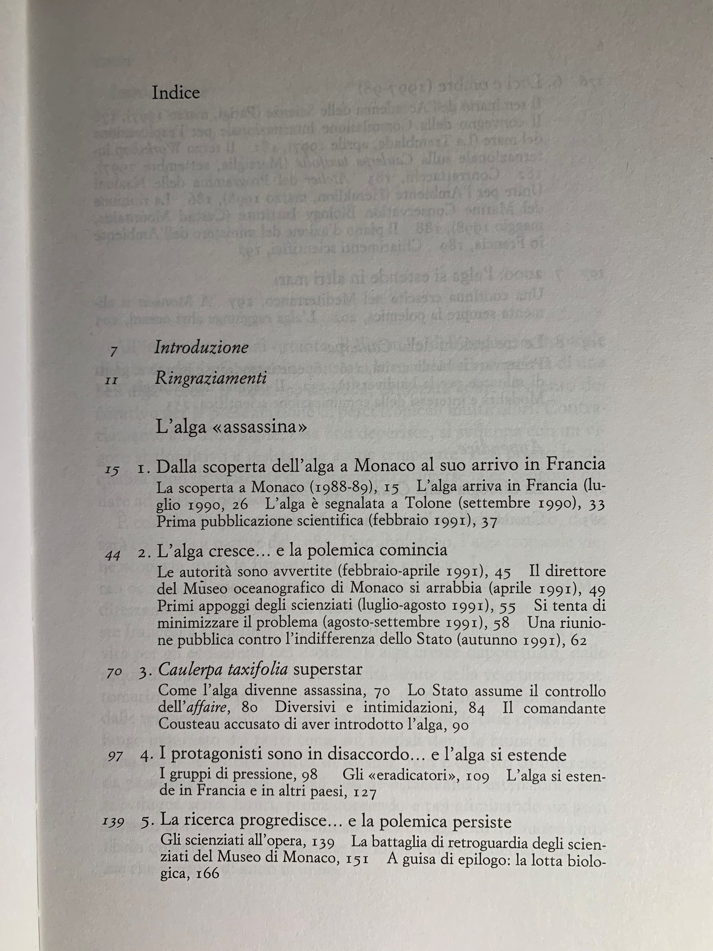 I ed. italiana ridotta e aggiornata a cura di Ulisse Franciosi: giugno 2001 (ed. originale: Le Roman noir de l'algue «tueuse» Caulerpa taxifolia contre le Méditerranée, Paris, Édition Belin 1997). Traduzione di Ulisse Franciosi. Collana Saggi Scienze. VIII/ 286+(2)=288/ brossura satinata (In copertina, Un subacqueo misura una colonia di Caulerpa taxifolia appena scoperta in Sicilia (Ganzirri, Messina, novembre 1993). L'alga riesce a crescere sulla nuda roccia. Foro dell'autore. Schema grafico della copertina di Pietro Palladino e Giulio Palmieri). Con figure in nero nel testo e riproduzioni fotografiche a colori in tavole patinate f.t.. Le fotografie sono state realizzate dall'autore. Stato buono (copertina polverosa).