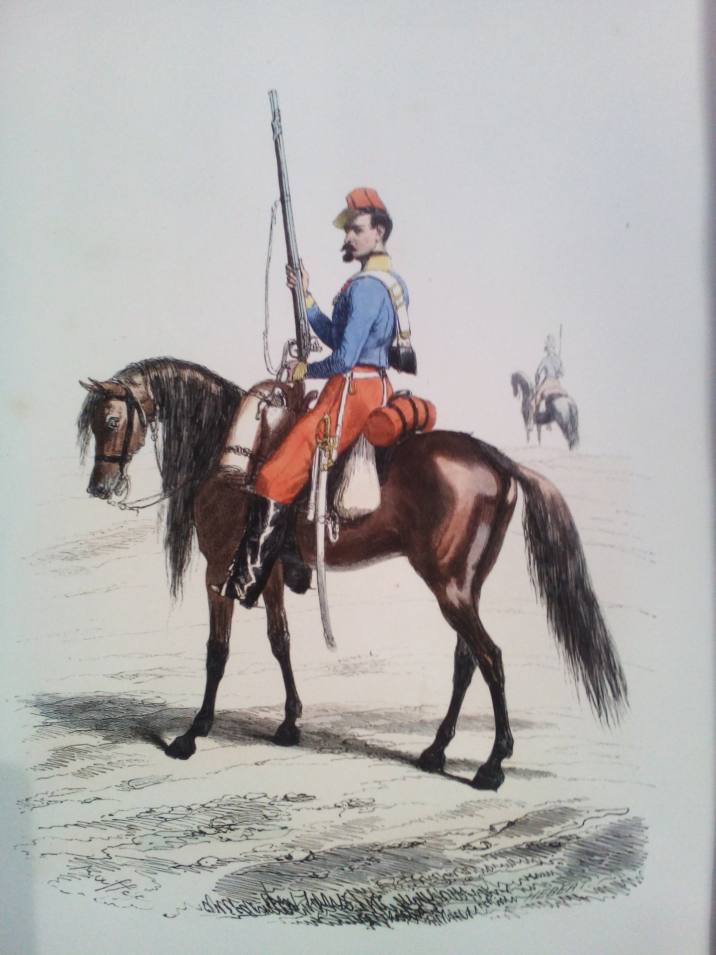 In 4°, p.(4)IV,637(3). 63 incisioni xilografiche n.t. + 24 tavole f.t. in acciaio di Raffet e altri + 12 tavole f.t. colorate a mano (militari e cavalieri) + 1 carta geografica ripiegata colorata. Sporadiche fioriture. Legatura in mezza pelle coeva, nervature e fregi in oro al dorso. (Vicaire, III, 856). Sporadiche fioriture, ma ottimo esemplare.