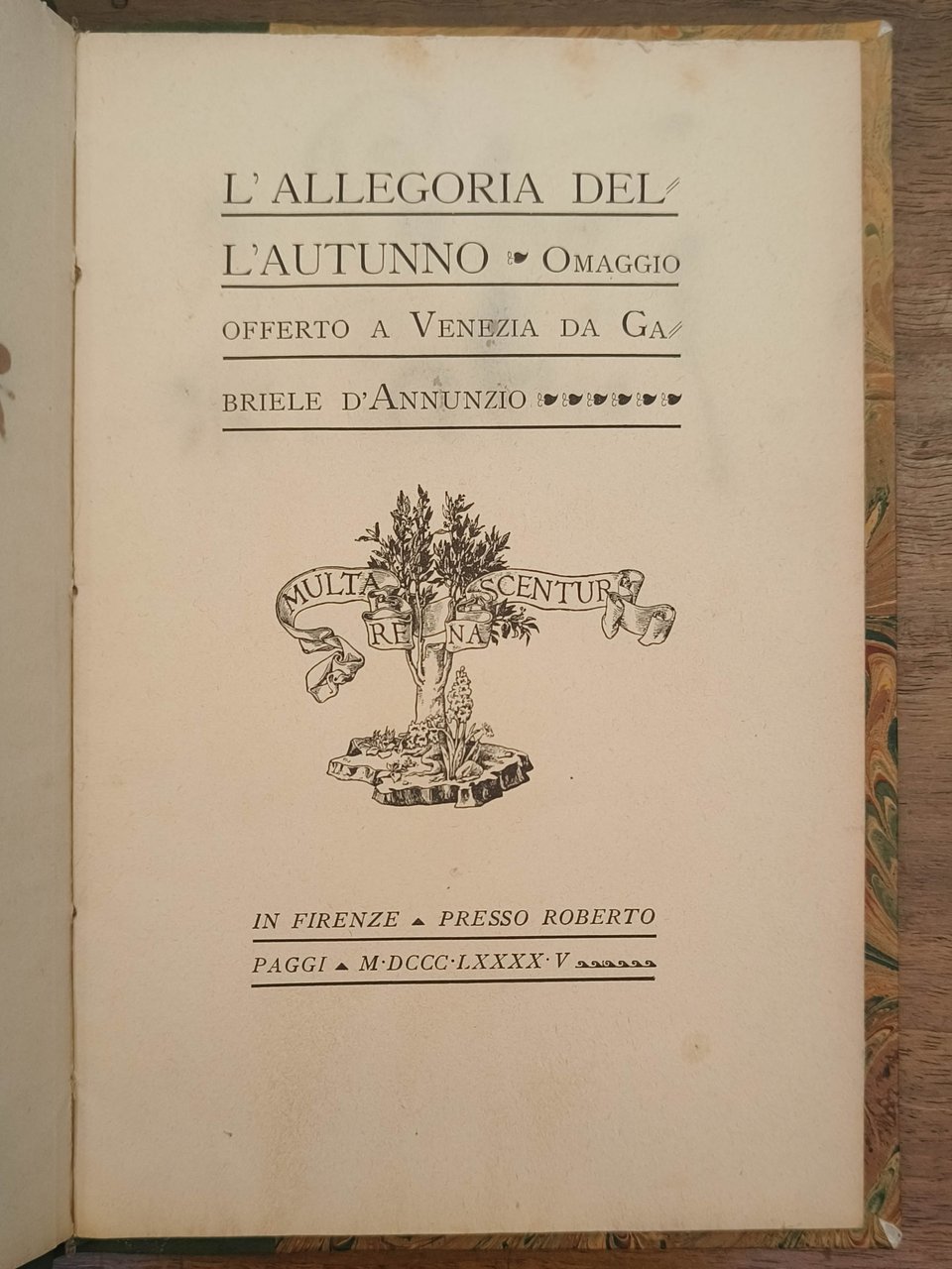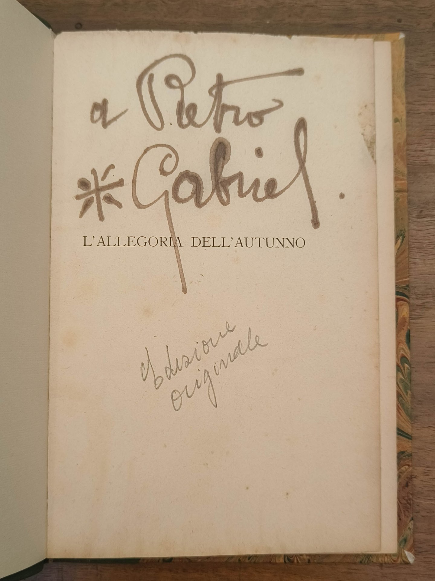 L'allegoria dell'autunno. Omaggio offerto a Venezia da Gabriele D'Annunzio, Firenze, Roberto Paggi, 1895. Prima edizione. Cm 19,8. Pp. 47. Legatura in mezza pelle e carta fiorentina. Dedica autografa dell'autore all'occhiello "A Pietro * Gabriel".