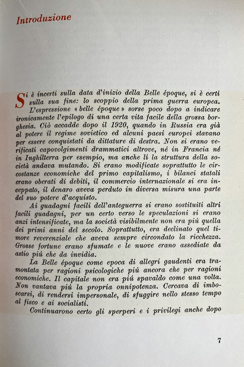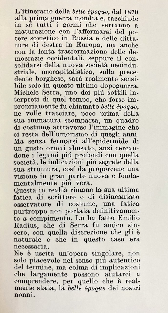 L'itinerario della belle époque, dal 1870 alla prima guerra mondiale, racchiude in sé tutti i germi che verranno a maturazione con l'affermarsi del potere sovietico in Russia e delle dittature di destra in Europa, ma anche con la lenta trasformazione delle democrazie occidentali, seppure il consolidarsi della nuova società neoindustriale, neocapitalistica, sulla precedente borghese, sarà realmente sensibile solo in questo ultimo dopoguerra. Michele Serra, uno dei più sottili interpreti di quel tempo, che forse impropriamente fu chiamato belle époque, ne volle tracciare, poco prima della sua immatura scomparsa, un quadro di costume attraverso l'immagine che ci resta dell'umorismo di quegli anni. Ma senza fermarsi all'epidermide di un gusto ormai abusato, anzi cercandone i legami più profondi con quella società, le indicazioni più segrete della sua struttura, così da proporcene una visione in gran parte nuova e fondamentalmente più vera.