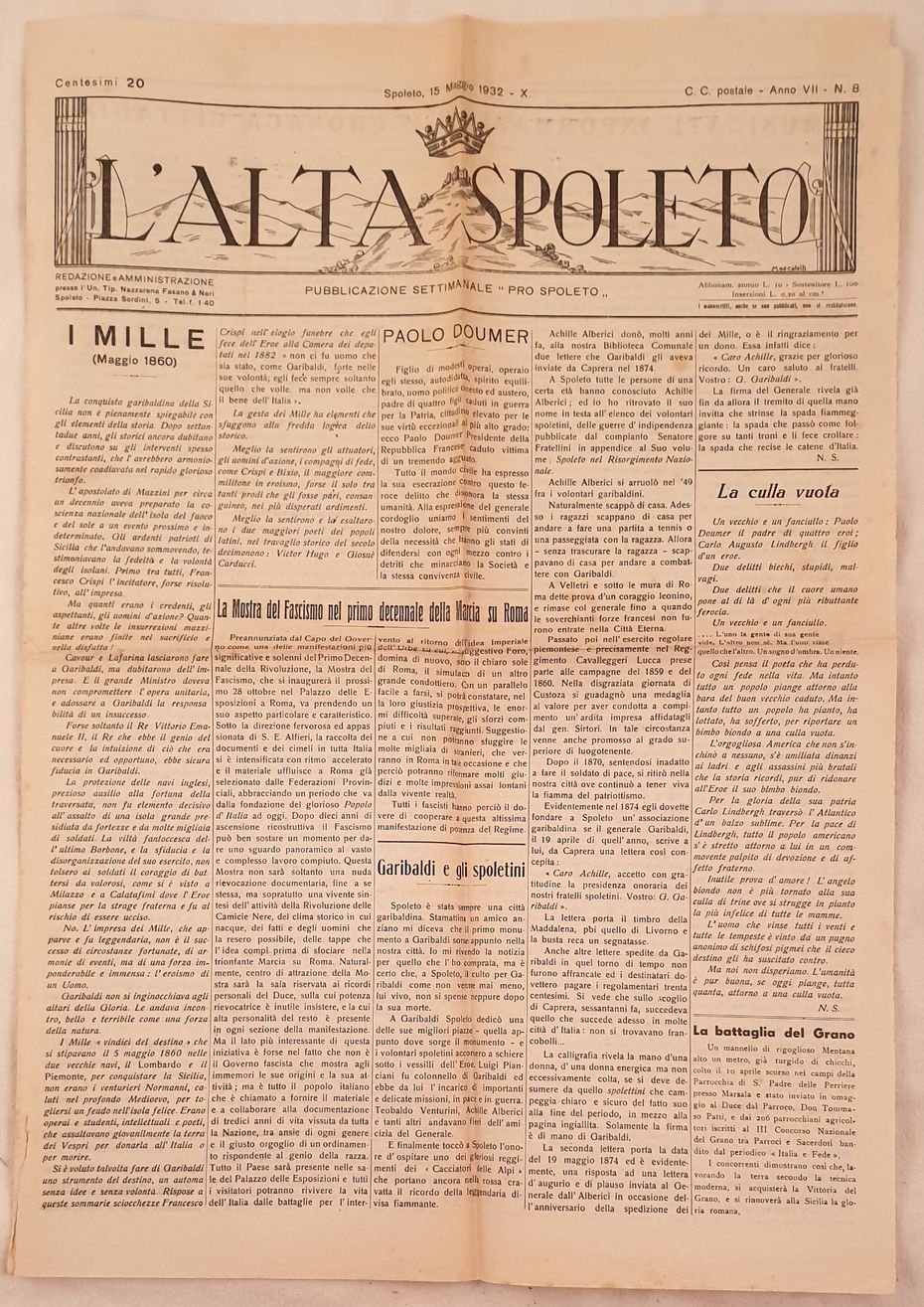 Numero del 15 maggio 1932 di questo raro settimanale locale pubblicato dal 1932 al 1940.<BR><BR>Tra gli articoli presenti: I Mille (Maggio 1860), Paolo Doumer, La mostra del fascismo nel primo decennale della Marcia su Roma, Garibaldini e Spoletini, Giovanni Calzia, Radio raduno nazionale, Pellegrinaggio nazionale a Caprera, Approviggiamento dei coloni bisognosi, I nostri agricoltori a Roma, La luna sulla montagna, Alla fiera esposizione del Littorale ecc.<BR><BR>Belle pubblicità. In buone condizioni.<BR><BR>Raro.<BR><BR>Brossura editoriale in buone condizioni generali con lievi usure ai margini e dorso. Piegature. All'interno le pagine si presentano in buone condizioni con fioriture. Piegature. In folio. Dim. 54x40 cm. Pp. 4.