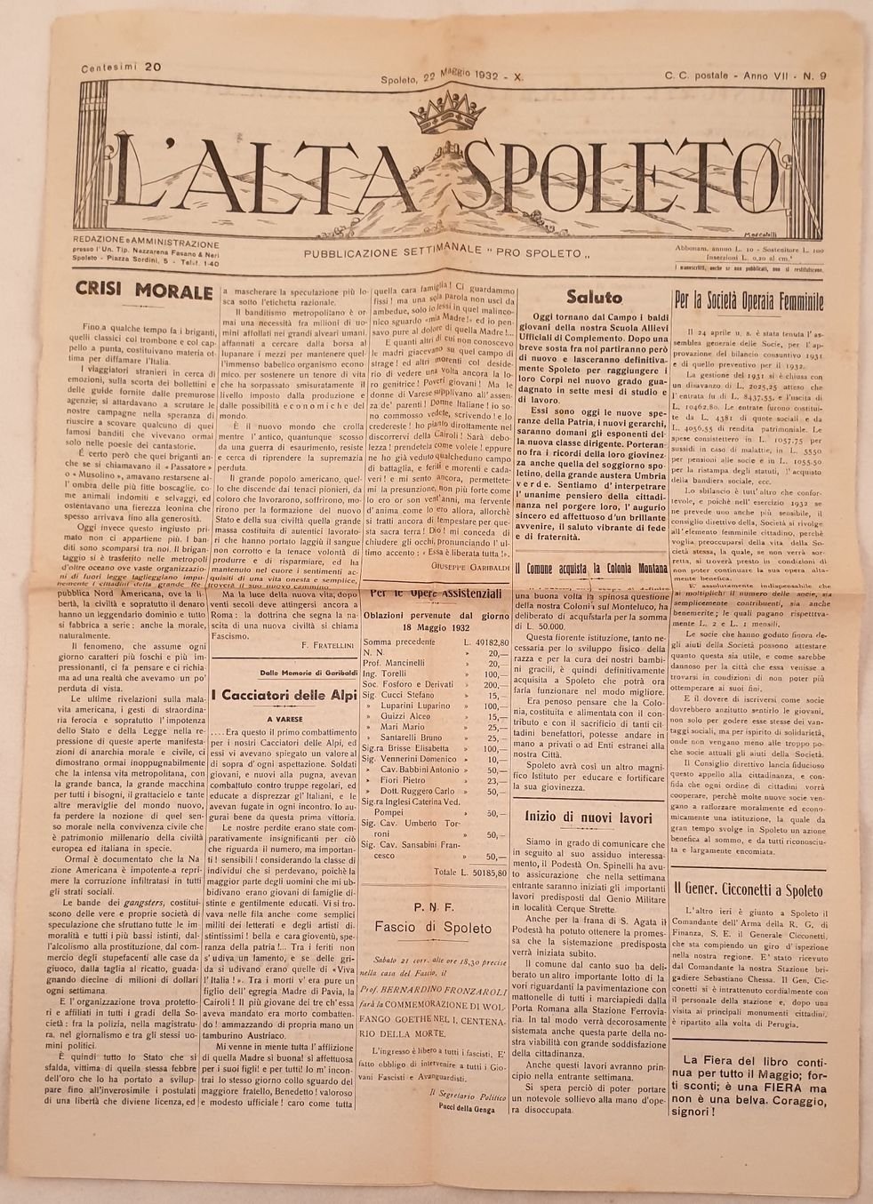 L'ALTA SPOLETO SPOLETO 22 MAGGIO 1932 PUBBLICAZIONE SETIMANALE PRO SPOLETO