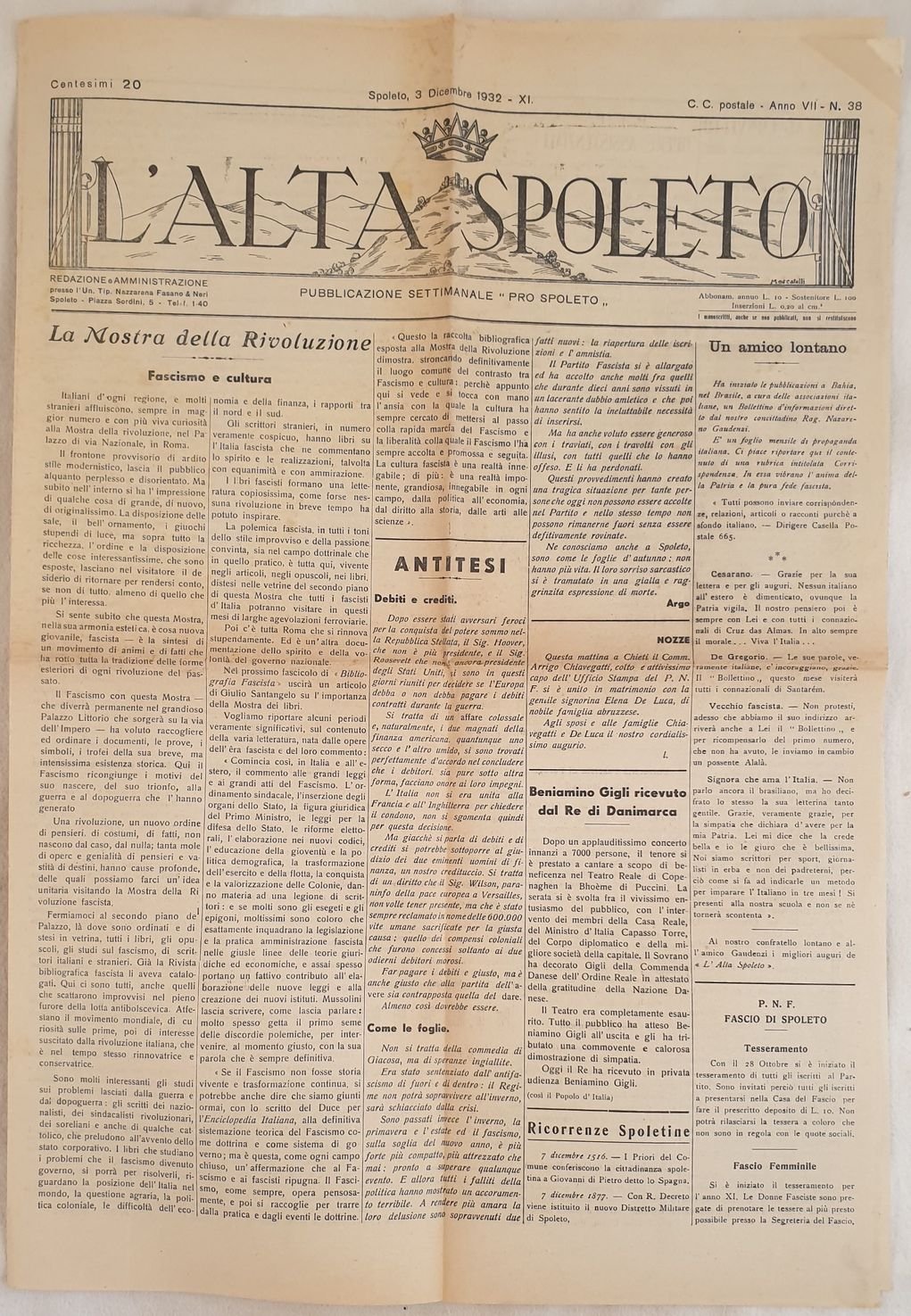 L'ALTA SPOLETO SPOLETO 3 DICEMBRE 1932 PUBBLICAZIONE SETTIMANALE PRO SPOLETO