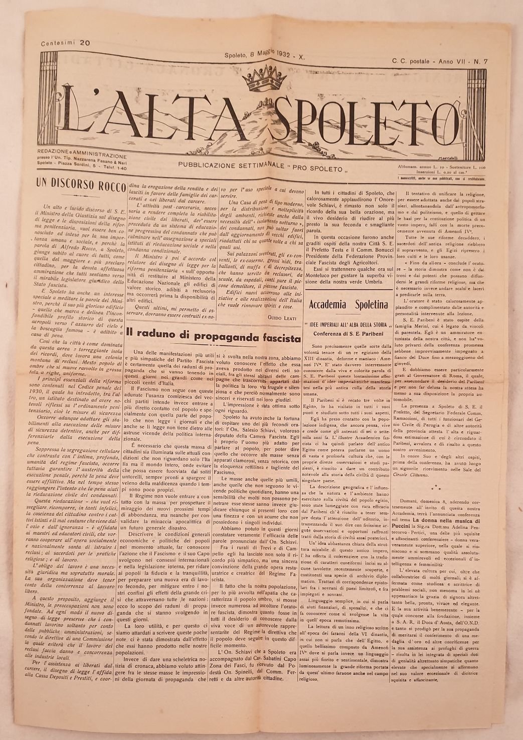 L'ALTA SPOLETO SPOLETO 8 MAGGIO 1932 PUBBLICAZIONE SETIMANALE PRO SPOLETO