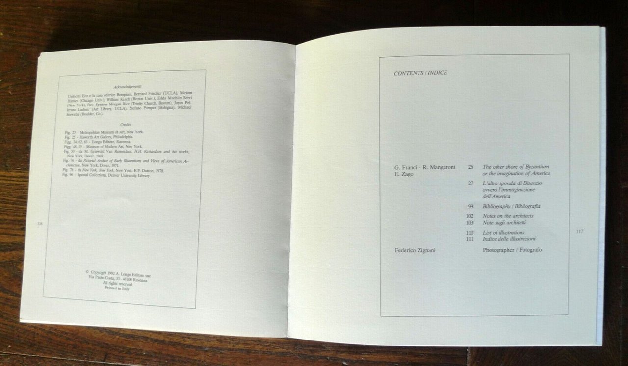 L'ALTRA SPONDA DI BISANZIOOVVERO L'IMMAGINAZIONE DELL'AMERICA.THE OTHER SHORE OF BYZANTIUMOR THE IMAGINATION OF AMERICA.Testi di Giovanna Franci, Rosella Mangaroni,Ester Zago.Fotografie di Federico Zignani.Longo Editore, Ravenna 1992,brossura, 22x22 cm., pp.117,illustrazioni in nero e a colori,testo in italiano ed inglese,peso: g.500