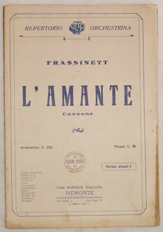 In 8. cm 26,5x18. Pp 13. partitura completa per orchestra del 1930 di una canzone. Caratteristica copertina illustrata d'epoca. Ex libris in copertina. In buone condizioni, dorso usurato. a complete score for orchestra of 1930. Carachteristic decorated cover of that period. Ex libris in the cover. In fair conditions, wearings in the spine.