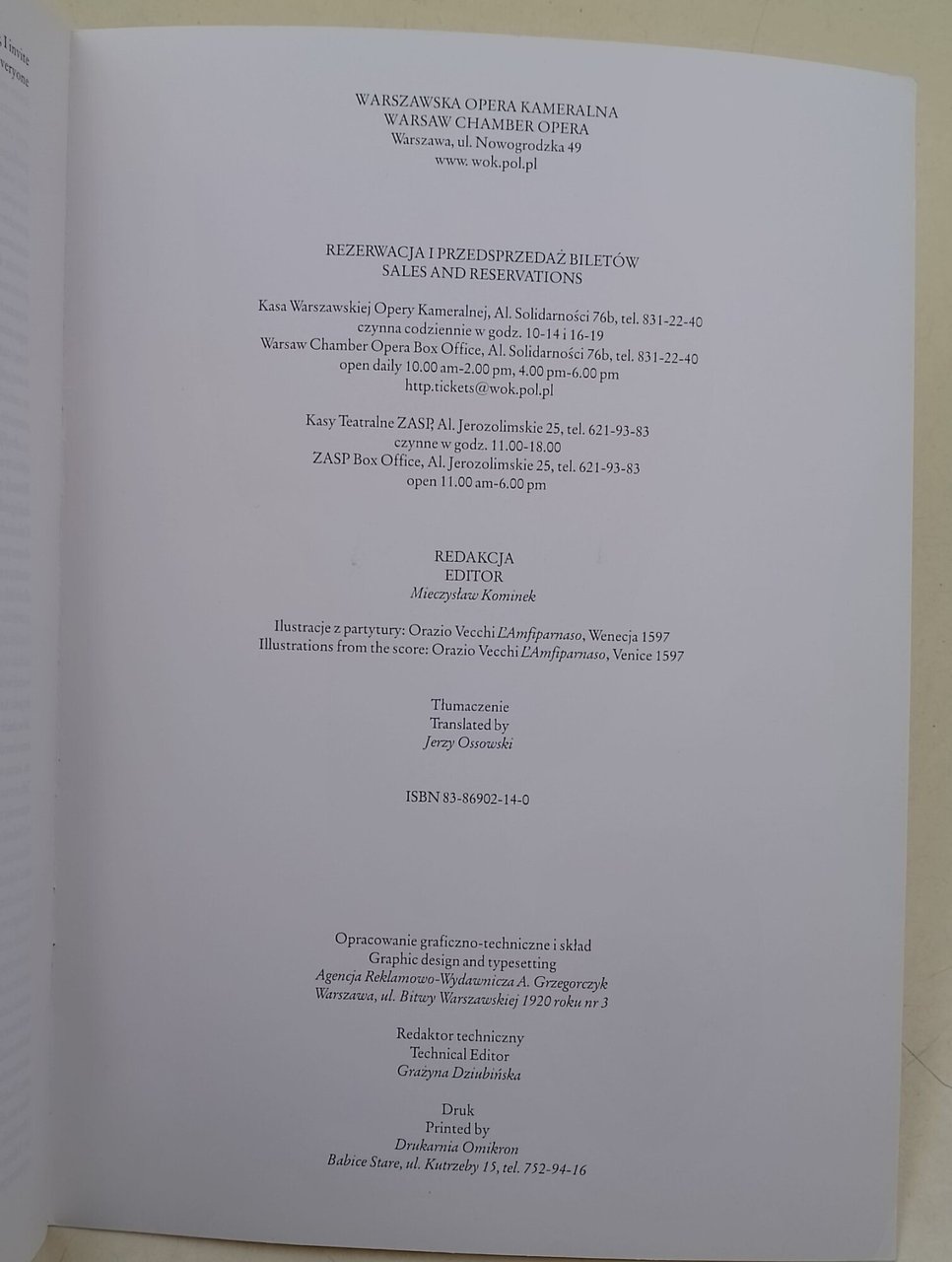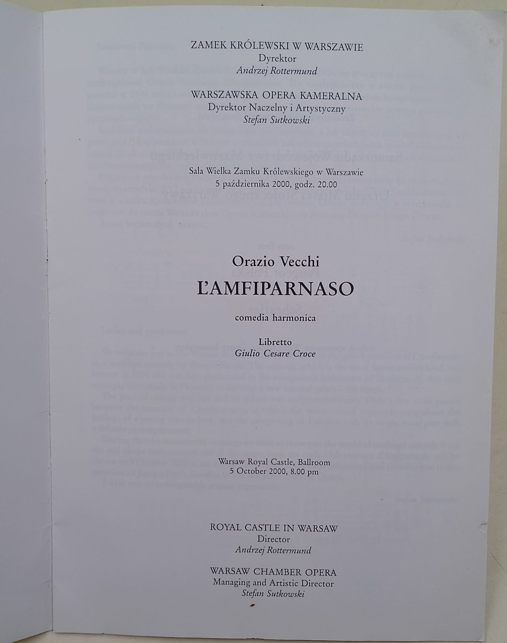 I 4', br. ed. a punta di spillo, programma di sala, libretto Giulio Cesare Croce, Warsaw Royal Castle, Ballroom 5 oct 2000; lievi pieghe e segni d'uso, buon es.