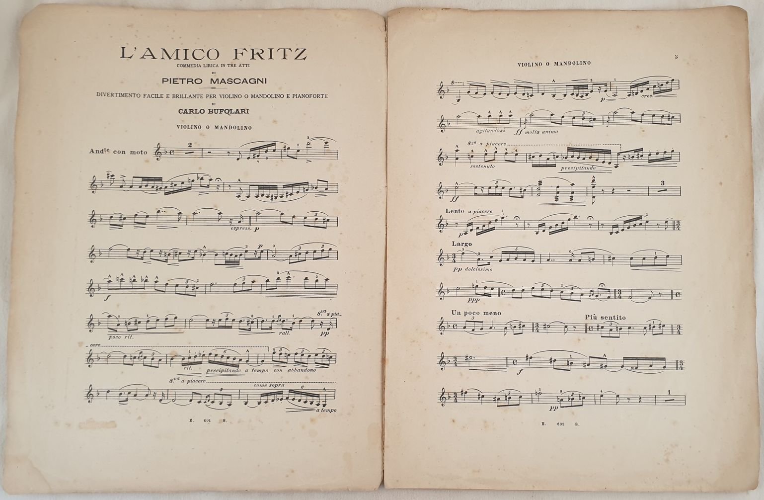 L'AMICO FRITZ COMMEDIA LIRICA IN TRE ATTI DI PIETRO MASCAGNI DIVERTIMENTO FACILE E BRILLANTE PER VIOLINO O MANDOLINOE PIANOFORTE