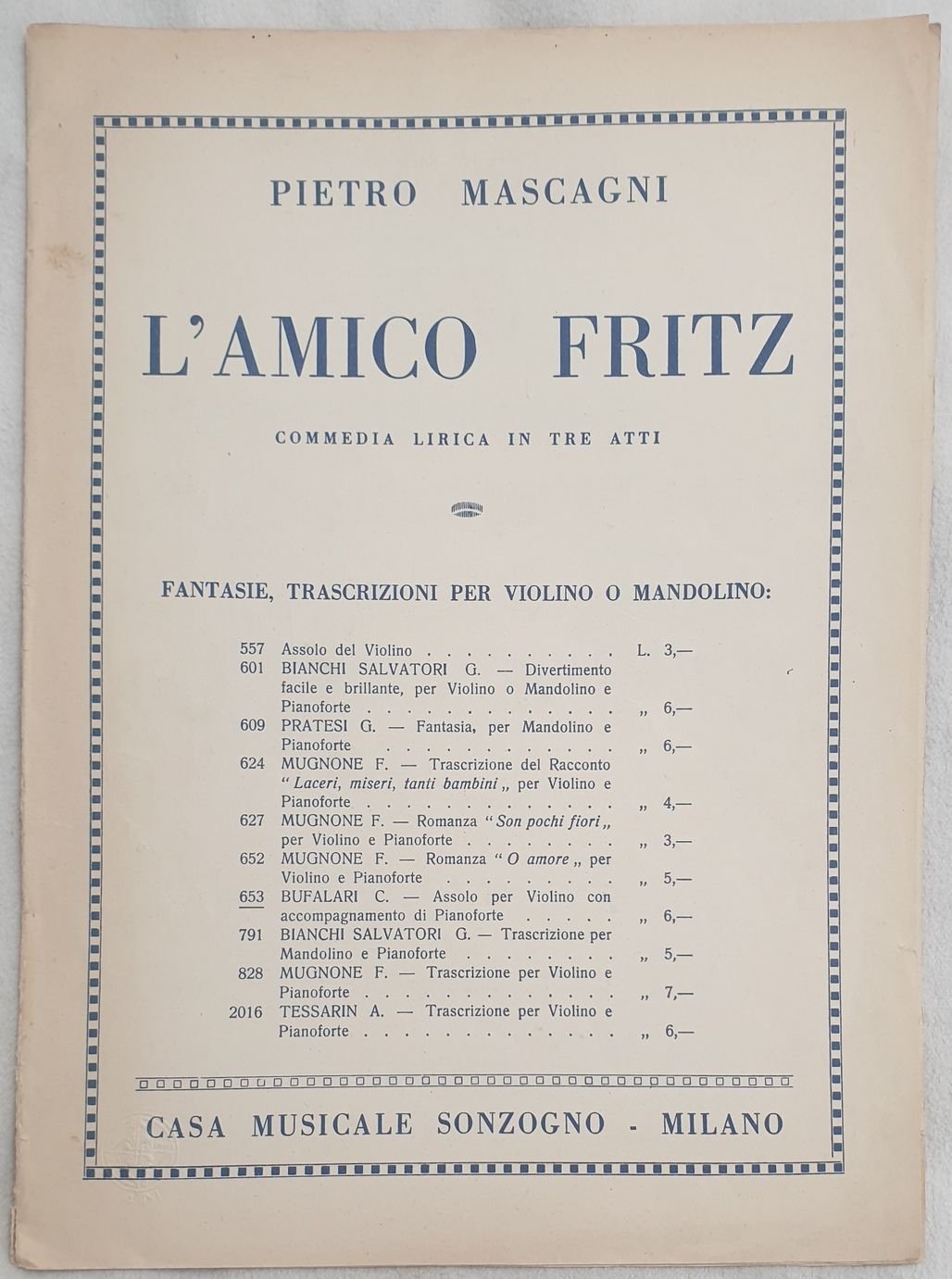 Bello spartito senza data ma degli anni 30 di questo spartito per violino con accompagnamento di pianoforte della melodia "L'Amico Fritz" di Pietro Mascagni adattato da Carlo Bufolari. Presente partitura per violino con accompagnamento di pianoforte. In buone condizioni. Copertina editoriale in buone condizioni con lievi usure ai margini e dorso. Legatura editorialmente assente. Pagine in ottime condizioni con rare fioriture. In folio. cm. 34x24,5. Pp. 6. Beautiful musical score of 1930's of the melody "L'Amico Fritz" by Pietro Mascagni for violin and violin with piano adapted by Carlo Bufolari. Musical score for violin and violin with piano. In good conditions. Carton cover of 20th century in good conditions slightly worn in the edges and spine. Binding is editoriarly missing. Pages in very good conditions with occasional foxings. In folio. cm. 34x24,5. Pp. 6.