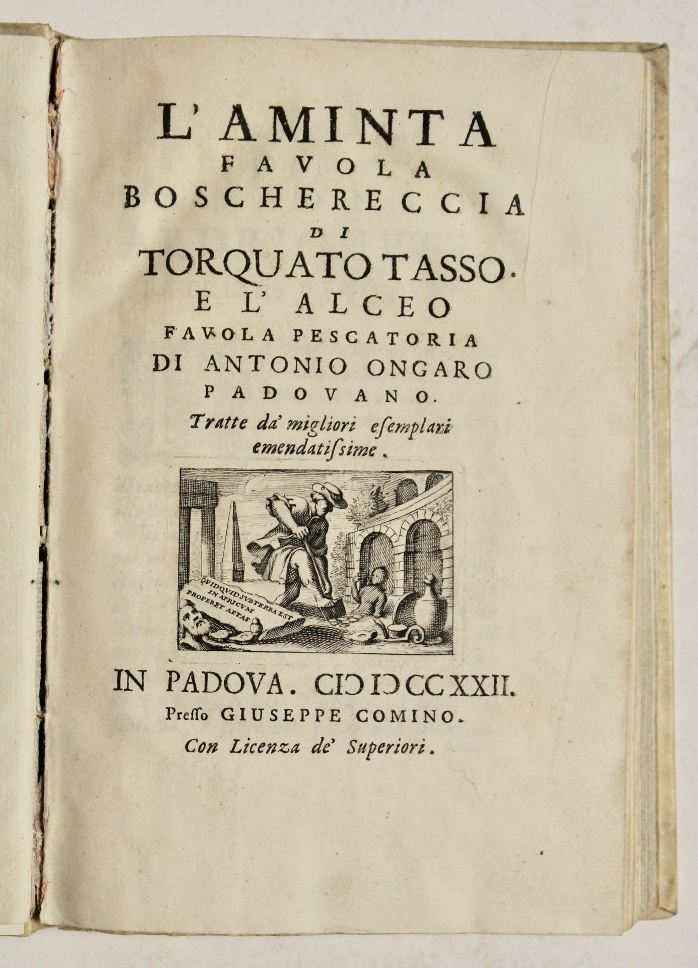 In 8° (mm 175x117); pagg. XXIV, 187, (5). Vignetta in rame al frontespizio, iniziali ornati e fregi silografici. Pergamena rigida coeva con titolo su tassello al dorso. Bell'esemplare ben conservato. Federici; pp. 97-98: "Le 24 pp. segnate alla romana contengono il catalogo delle ediz. dell'Aminta e delle traduz. in diverse lingue, varie osservazioni sulle varianti e la dedica di Aldo premessa alla prima ediz Il pregio di questa ediz. è singolare. La diligenza usata da A. Volpi per fare che uscisse la migliore " Allacci; p. 51: "Ediz. correttissima ". Gamba, 956; Fontanini I, 449; Brunet V, 672; Graesse VII, pag. 37; Raccolta Tassiana, 1201.