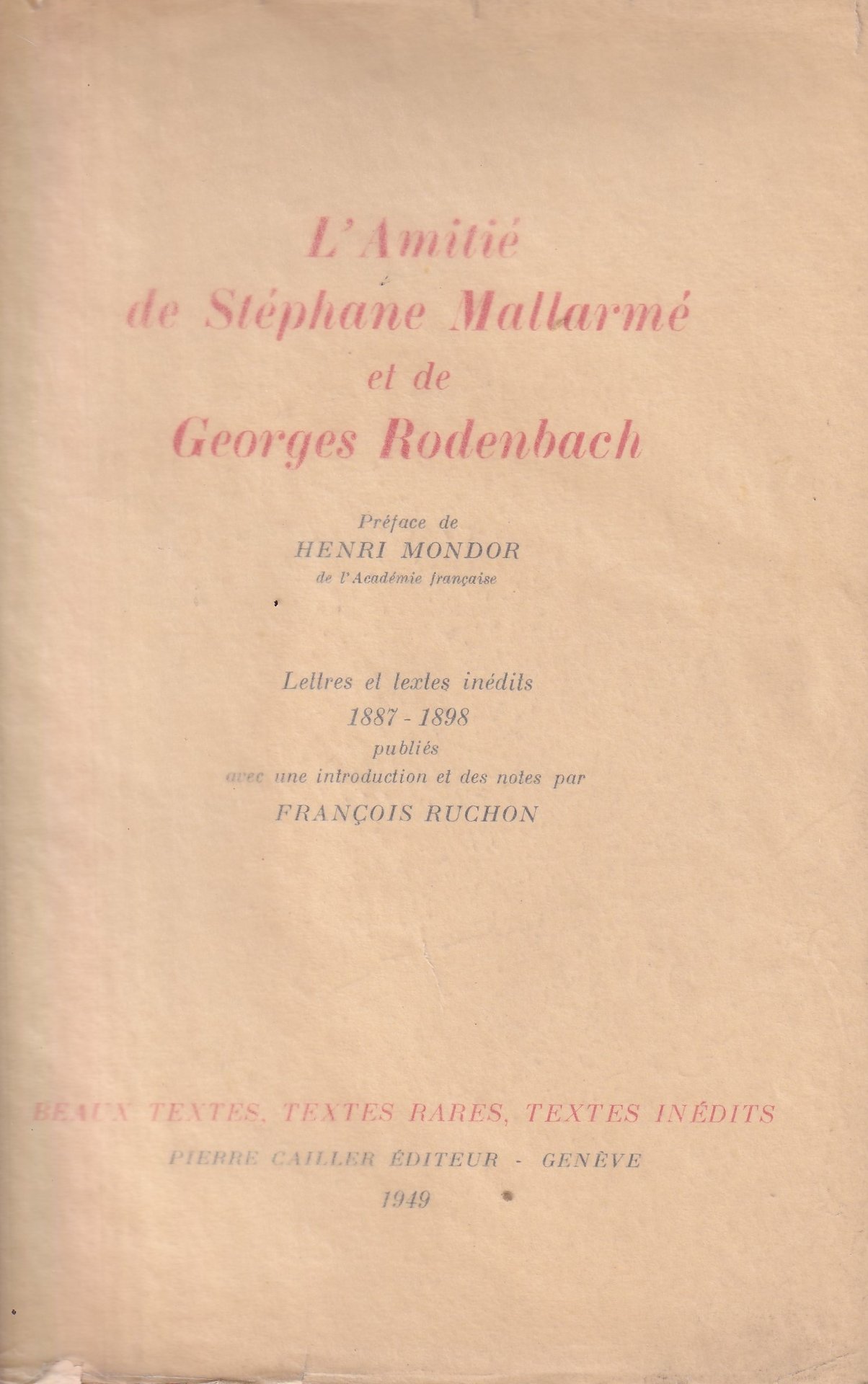 *L'Amitie de Stephane Mallarme et de Georges Rodenbach. Preface de Henri Mondor.
