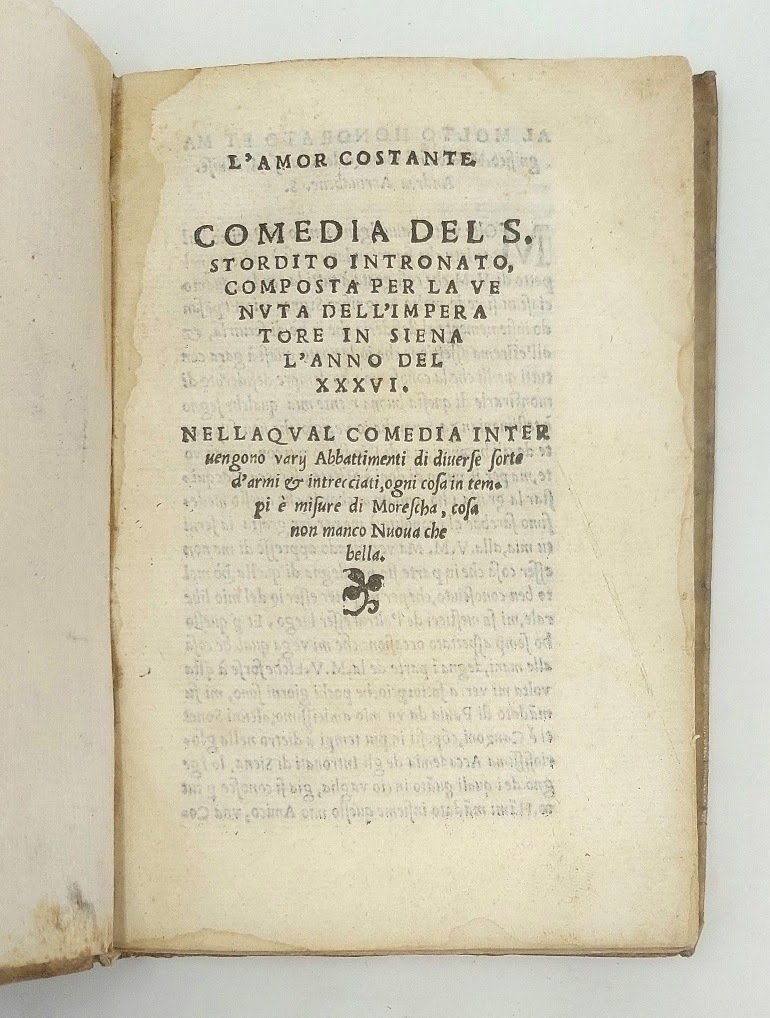 L'amor costante. Comedia del S. Stordito Intronato, composta per la venuta dell'Imperatore in Siena l'anno del XXXVI. Nella qual comedia intervengono varij abbattimenti di diverse sorte d'armi et intrcciati, ogni cosa in tempi e misure di Morescha, cosa non manco nuova che bella.