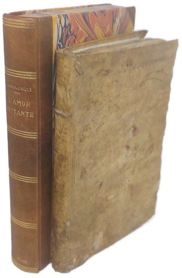 >in-8, ff. 78, (1 bianco presente, manca altro f. bianco), legatura coeva in pergamena floscia, note ms. al piatto anteriore, in astuccio m. pelle e ang. con tit. e filetti oro al dorso. Dedica dello stampatore A. Arrivabene a Giovanni Soranzo datata 15 novembre 1540. Il nome dell'autore viene citato nella dedica ed in fine al volumetto. Prima edizione, estremamente rara, di questa commedia in cinque atti in prosa, con prologo, ambientata nella città di Pisa. Rappresentata per la prima volta a Siena nel 1536, alla presenza dell'imperatore Carlo V, la commedia mette sul palcoscenico ben ventisette personaggi che parlano italiano, spagnolo, dialetto napoletano e ''uno scolare tedesco esprimentesi in un italiano barbaro con qualche mistura della sua lingua nativa'' (Sanesi pp. 334-6); la trama, assai complessa, prevede il lieto fine per i due protagonisti, Ferrante e Ginevra: la pozione che erano stati costretti a bere non era veleno, bensì bevanda innocua, così i due ''potranno godere del loro costante amore'' (Sanesi). La commedia, al pari delle altre due del Piccolomini (L'Alessandro e L'Hortensio), ebbe grande successo ed un numero straordinario di edizioni. L'autore (Siena 1508 - 1579) fu intellettuale di cultura vastissima: letterato, filosofo, astronomo; tra i fondatori della celebre Accademia senese degli Intronati, col nome di Stordito, insegnò filosofia morale a Padova e poi a Roma; nel 1574 ottenne il titolo di Arcivescovo di Patrasso. Ottimo esemplare, puro e genuino. Ediz. mancante a Regenstein. Clubb 689. Allacci 55. Soleinne 4585: «Edition très rare». Salvioli 209. BMC 513. Adams P-1100.