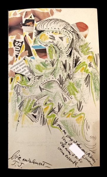 A pagina 1 disegno originale e collages a piena pagina dell'autore seguito da un piccolo disegno a pagina 2 e un altro a pagina 3, con dedica a importante saggista italiano.