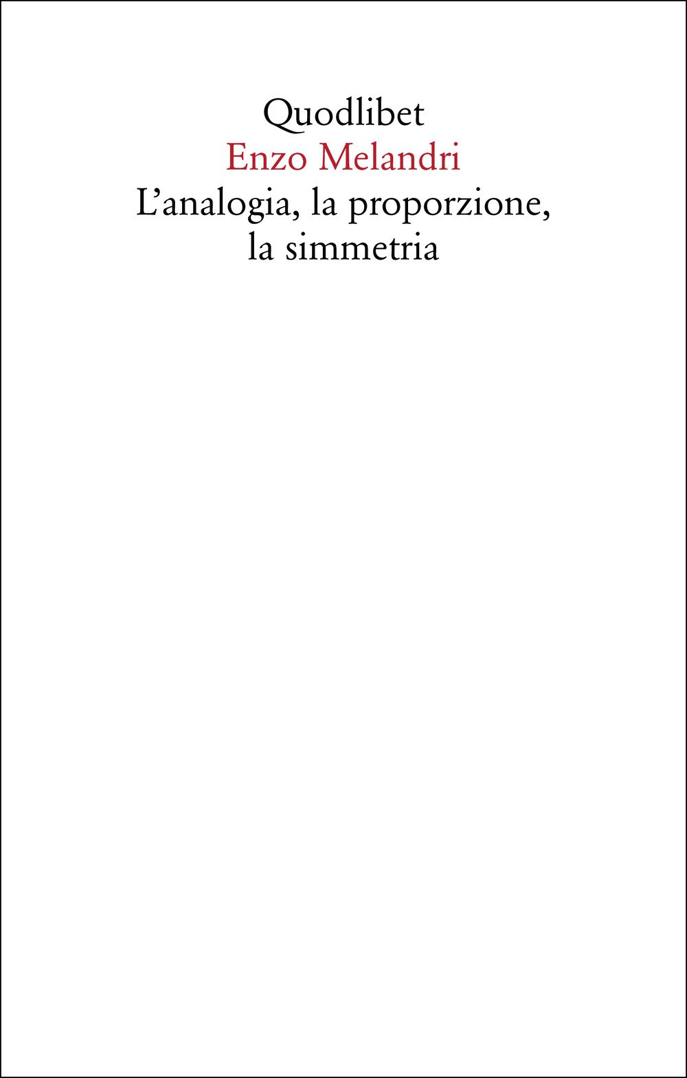 «L'analogia, la proporzione, la simmetria» (1974) si pone al centro della produzione di Enzo Melandri e chiude un periodo di intense ricerche intorno ai temi della fenomenologia e del pensiero logico, dense di sviluppi per la sua riflessione successiva. Richiamandosi, in particolare, ad Aristotele, Tommaso, Leibniz, Kant e Husserl, l'indagine è volta a mettere in evidenza la funzione dell'analogia nei procedimenti della conoscenza, nel pensiero creativo e nella capacità di rottura di schemi prefissati. Rispetto alle ricerche svolte in La linea e il circolo (1968), il suo opus magnum, Melandri mira qui a una sintesi in grado di far emergere la configurazione formale dell'analogia, individuando – sullo sfondo delle strutture simmetriche che regolano le espressioni del sapere – un "principio di complementarità" che lega il calcolo all'interpretazione, il controllo alla trasgressione, la continuità dell'esperienza vissuta alla discontinuità delle sue rappresentazioni simboliche.