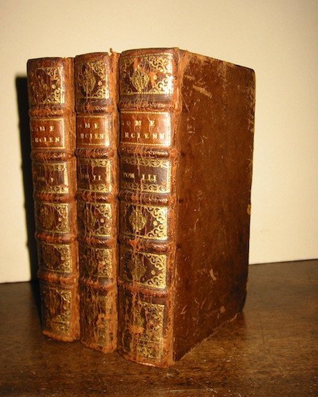 12mo (cm. 16), 4 Tomi legati in 3 Volumi, 14 cc.nn. (compreso frontis. a stampa in rosso e nero) con uno stemma del Dedicatario dell’opera ripiegato f.t., 284 pp. con 48 ill.ni n.t. e 3 tavv. rip. f.t. (’Italia antiqua’, ‘Aeneae Troiani navigatio’, ‘Le Grand Chemin Militaire.’); da p. 285 a p. 580 con 59 ill.ni n.t. e 4 tavv. f.t.; da p. 581 a p. 988 con 4 ill.ni n.t. e 4 tavv. f.t. (di cui una rip., ’Imperium Romanum’); da p. 989 a p. 1148. Ognuno dei quattro Tomi è preceduto da un frontespizio allegorico ripiegato. Legature coeve in piena pelle con nervi, ricchi fregi e titoli impressi in oro al ds. (minime tracce d’usura). Tagli rossi. Esemplare assai fresco ed in ottimo stato di conservazione. Rara edizione di questa splendida guida - tra le più ricche dal punto vista iconografico - opera del francese Deseine, attivo per molti anni a Roma come libraio e tipografo. Cicognara, 3698; Rossetti, G-1070.