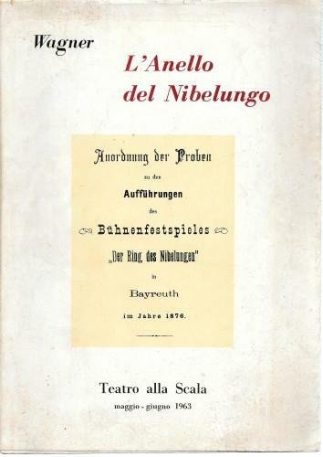 in 8°, pp. 103 (da 453 a 558), bross. edit. ill. con sovracop. ill. Guida alla Tetralogia: L'oro del Reno, La walkiria, Siegfried, Il crepuscolo degli Dei, con testo in italiano, francese, tedesco ed inglese, con le foto degli interpreti e i bozzetti delle scenografie in b/n. 152/36