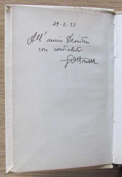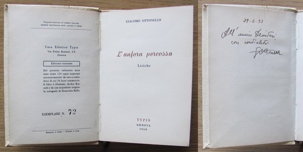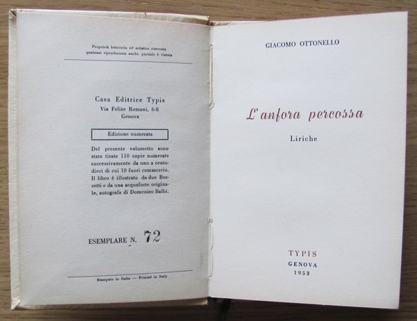 Dedica autografa dell'Autore al risguardo. 2 bozzetti e una acquaforte in b/n f.t. di Domenico Balbi. Casa Editrice Typis - Genova, I ed. 1953. Opera in tiratura limitata da 1 a 110, nostro esemplare n^72. Cartonato editoriale. 11x16; pp.79. Ottimo stato. , Buono (Good)