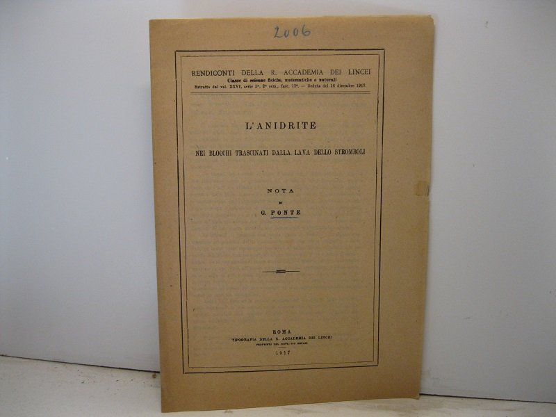 In 8, pp. 348-350. Br. ed. Estratto dai 'Rendiconti della R. Accademia dei Lincei. Classe di scienze fisiche, matematiche e naturali' (Vol. XXVI, serie 5, fasc. 12). Articolo sulle componenti mineralogiche della lava dello Stromboli.
