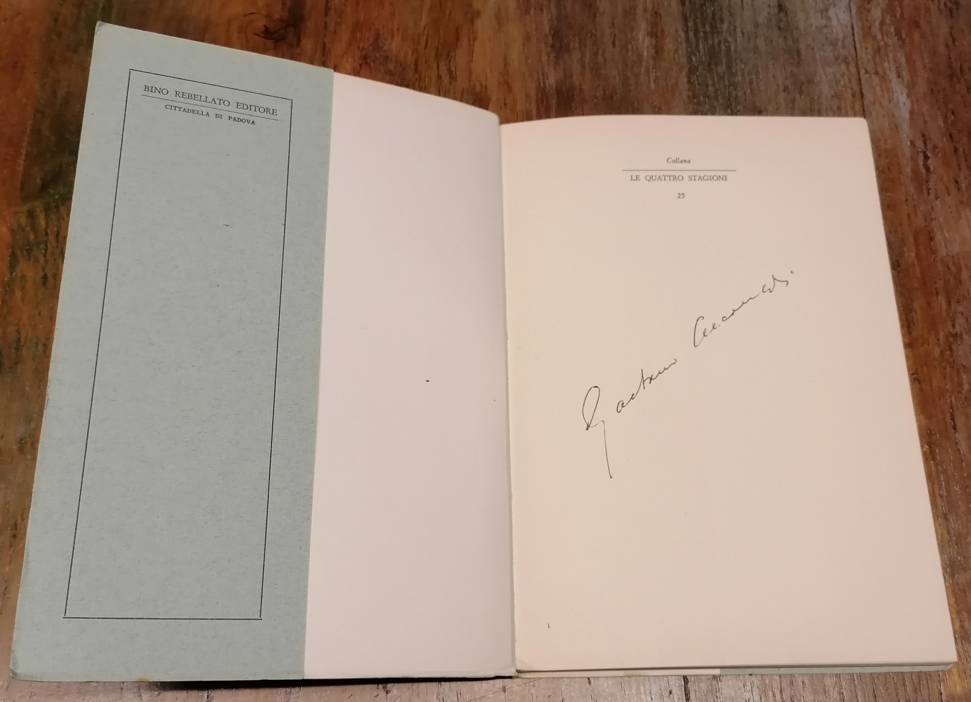 In 8°, brossura editoriale con sovraccoperta a stampa, pp. 91,(5), conservata la scheda bibliografica editoriale. Collana "Le quattro stagioni", n. 25. Prima edizione. Firma autografa dell'autore all'occhiello. Volume ben conservato.