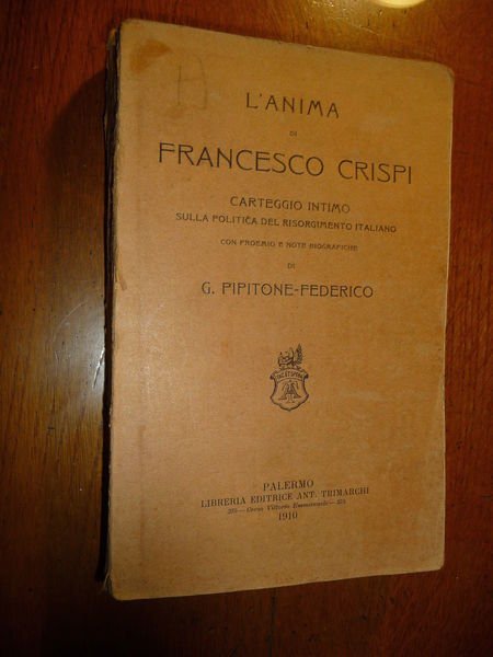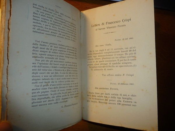 DESCRIZIONE: Palermo, Trimarchi, 1910 in-8° pic., pp. LX-192. Il vol. nelle prime XL pagine di prefazione tratta della figura di Francesco CRISPI. Vi sono poi le trascrizioni delle lettere di Francesco CRISPI al Barone Vincenzo FAVARA (da pp. 1 a pp. 84). Da pp. 87 a pp. 106 Lettere Varie, ed infine l'ultima parte del vol. è rappresentata dalle "Note alle lettere". CONDIZIONI: Accettabili dorso con difetti. Il vol. è stato oggetto di studio e presenta sottolineature in blu e rosso all'interno. Timbro di ex-libris all'interno. PESO / WEIGHT: 264 gr. without package