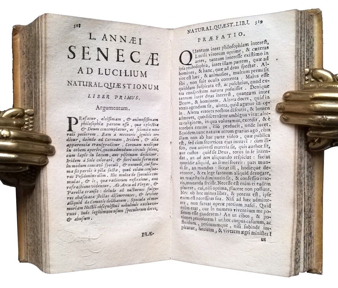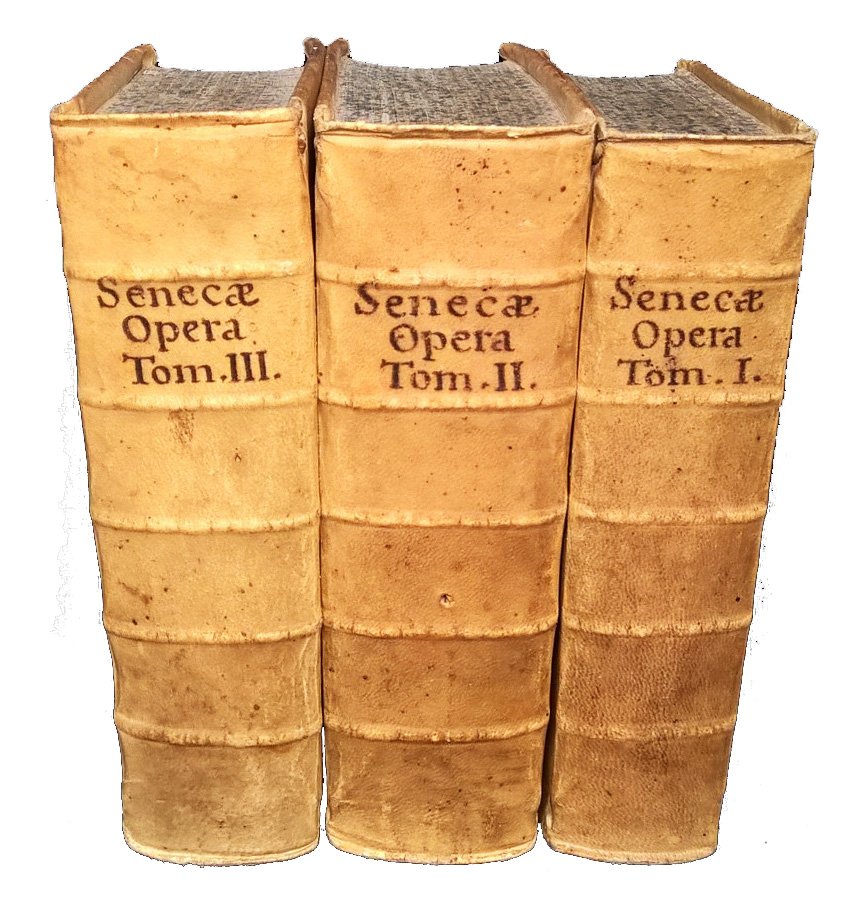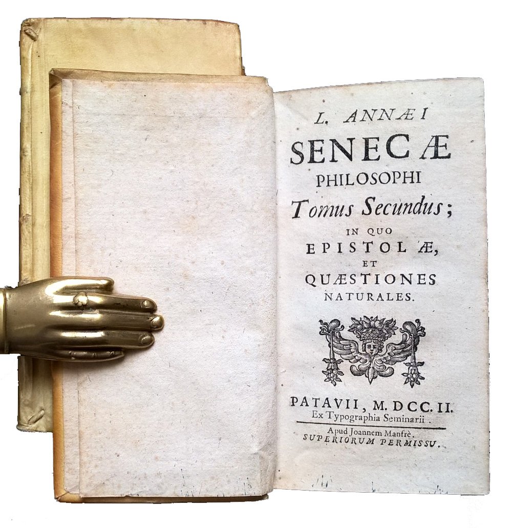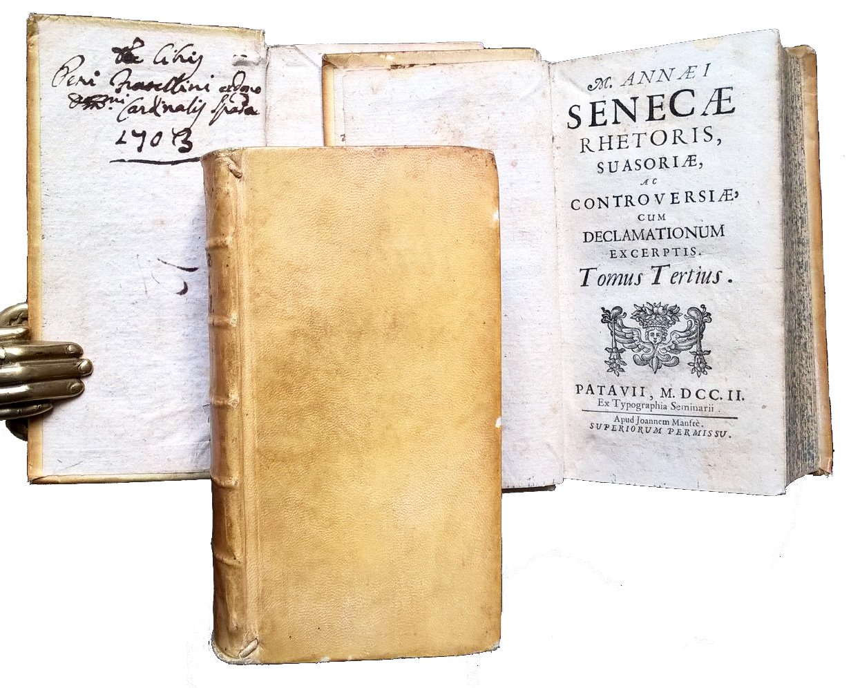 in-12°, 150x76 mm, leg. coeva rigida in piena pergamena, dorso a cinque nervi, titolo manoscritto al dorso, tagli spruzzati di verde; 3 volumi; pp. [24], 559, [1]; 744 ; 604. Fregio xil. sui frontespizi. Iniziali xil. Titolo generale dall'occhietto del v. 1. Titoli dei tre volumi: 1: Tomus primus continens opuscula moralia. 2: Tomus secundus; in quo epistolae et quaestiones naturales. 3: M. Annaei Senecae Rhetoris, Suasoriae ac controversiae cum declamationum excerptis. Tomus Tertius. Bella edizione padovana dell'inizio del XVIII secolo delle opere filosofiche senechiane. Prov.: Indicazioni d'appartenenza manoscritte ai contropiatti anteriori (ex libris … Fratellini ex dono E.mo Cardinalis Spada 1703). Rif.: IT\ICCU\TO0E\050782. OCLC, 797731504. Cond.: Lievissime tracce d'uso. Esemplare in condizioni quasi ottime. Peso: 995 g.